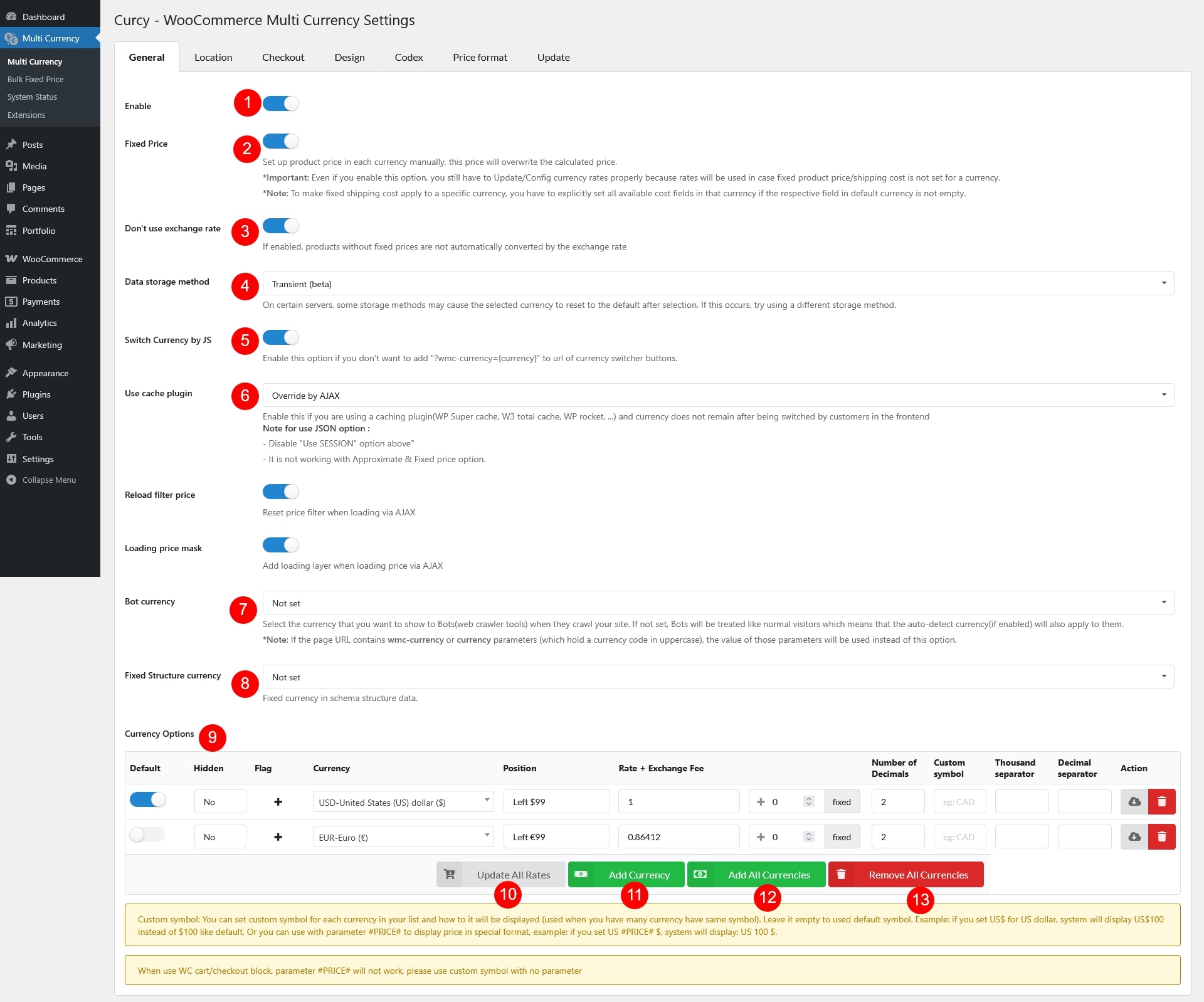 After activating the plugin, start building a list of currencies in the General settings. This is an important part as the currency list is the basis, all other functions of the plugin will work based on this list.
