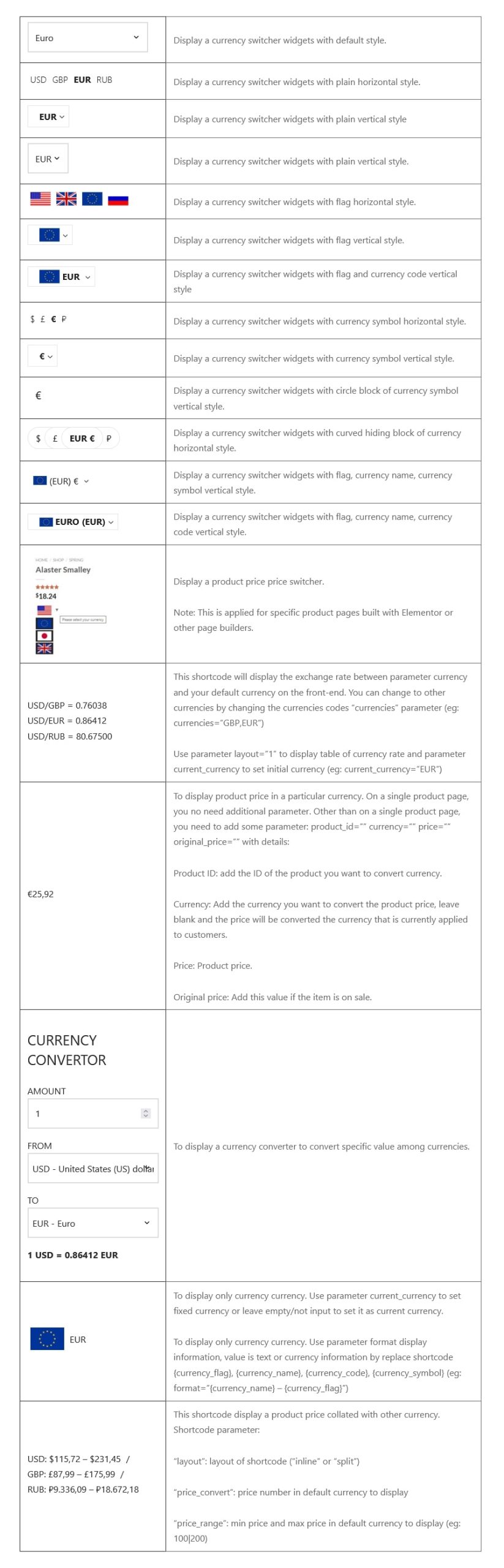The plugin provides you shortcodes to display currencies exchange widgets, exchange rates on the front-end. Go to Dashboard >> Multi Currency >> Codex to view supported shortcodes.