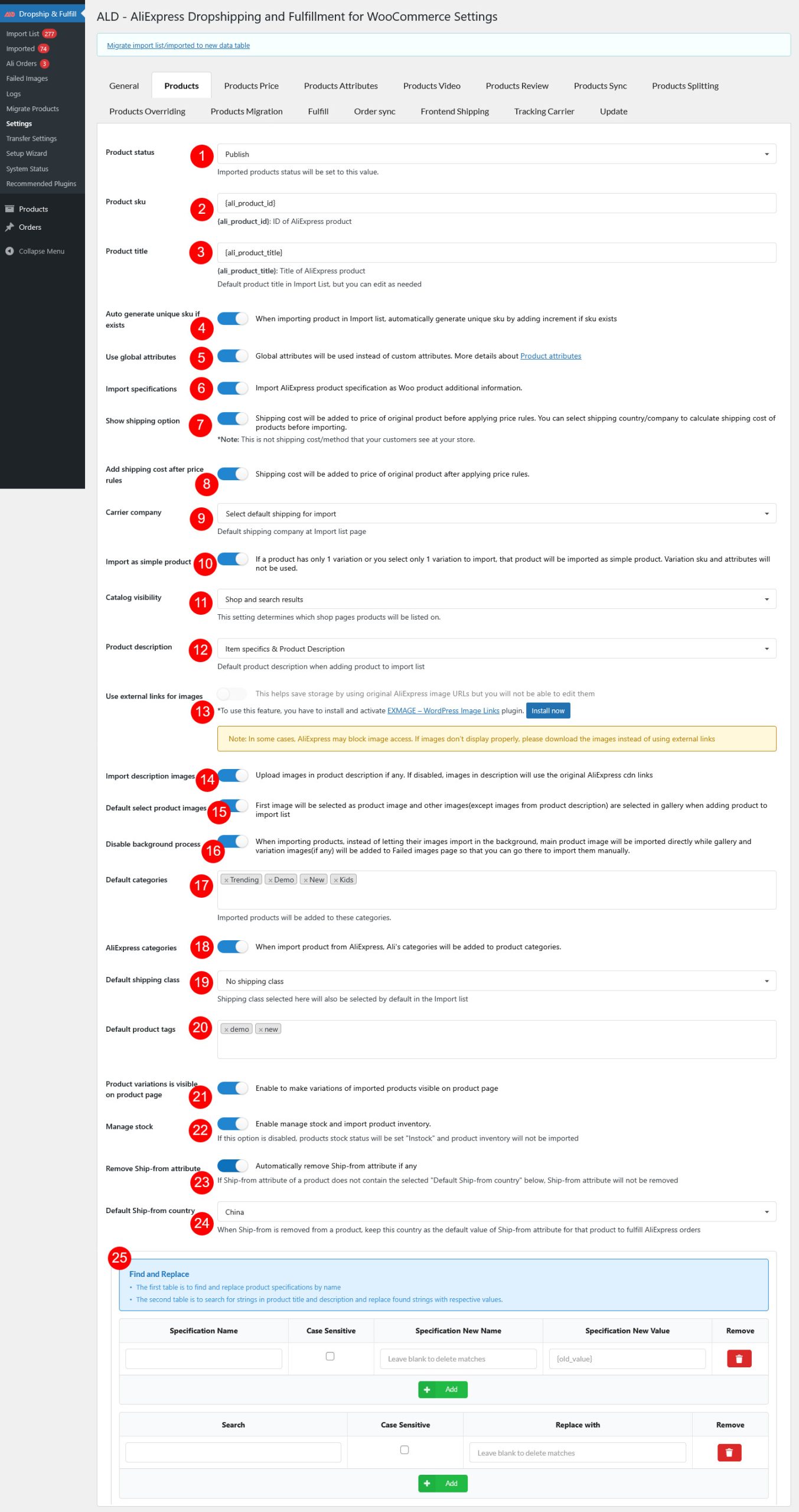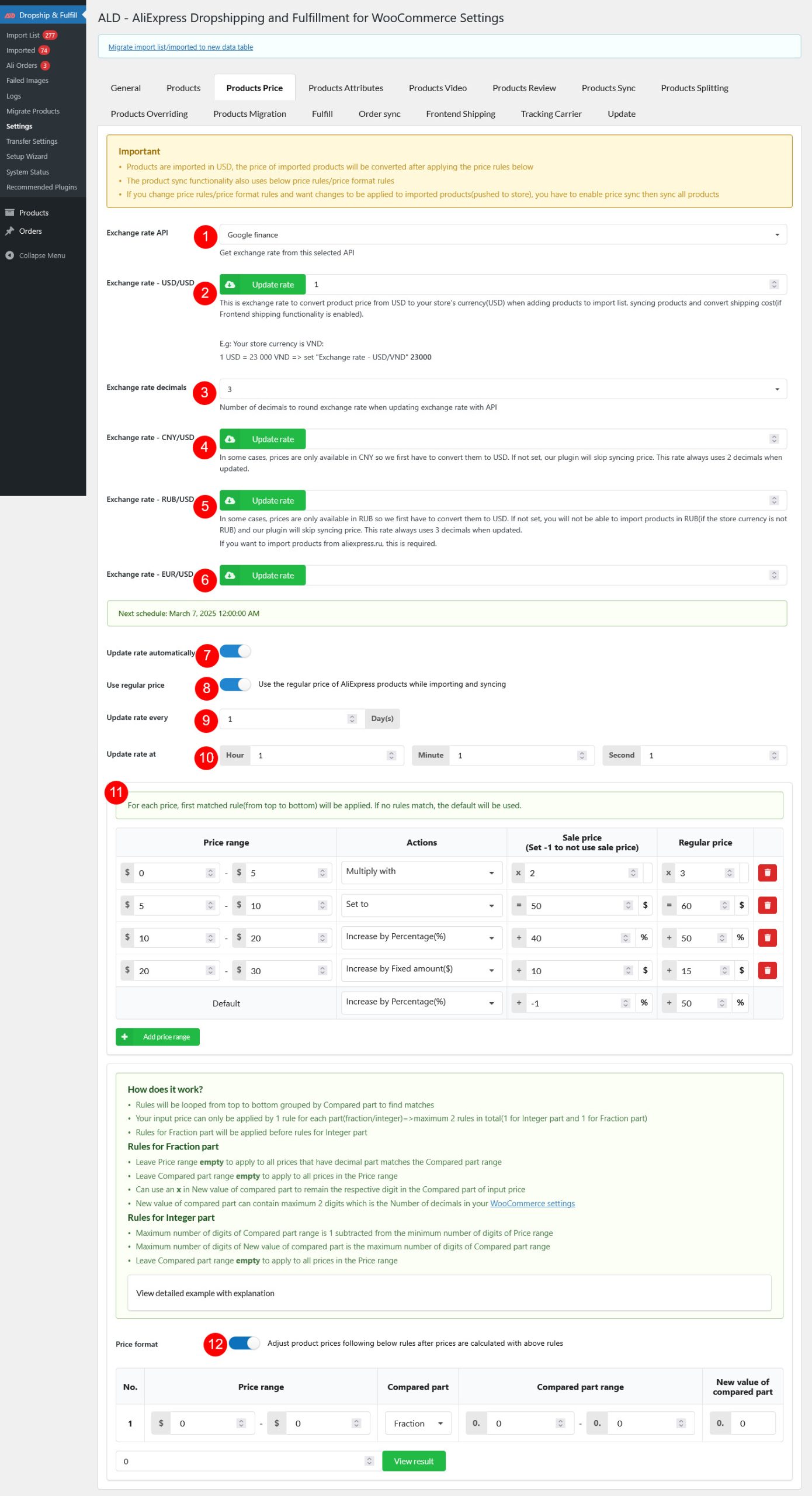 Product Price Settings – Pricing rules, price rounding rules, and markup settings for imported products.