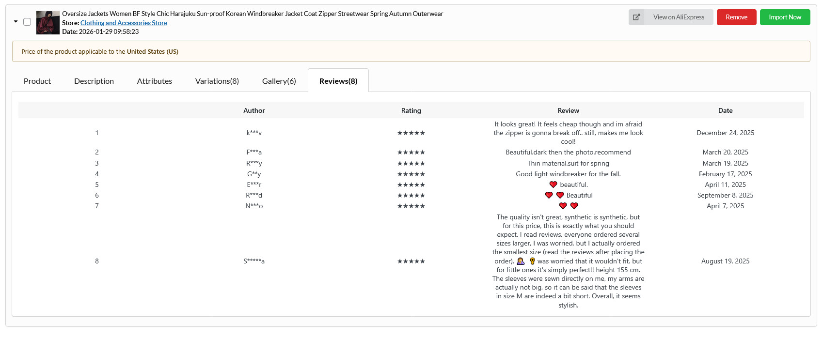 This feature works only with the Chrome extension. Reviews will not be imported for products added via the API. When enabled, reviews are imported together with product details and shown in the Reviews tab.