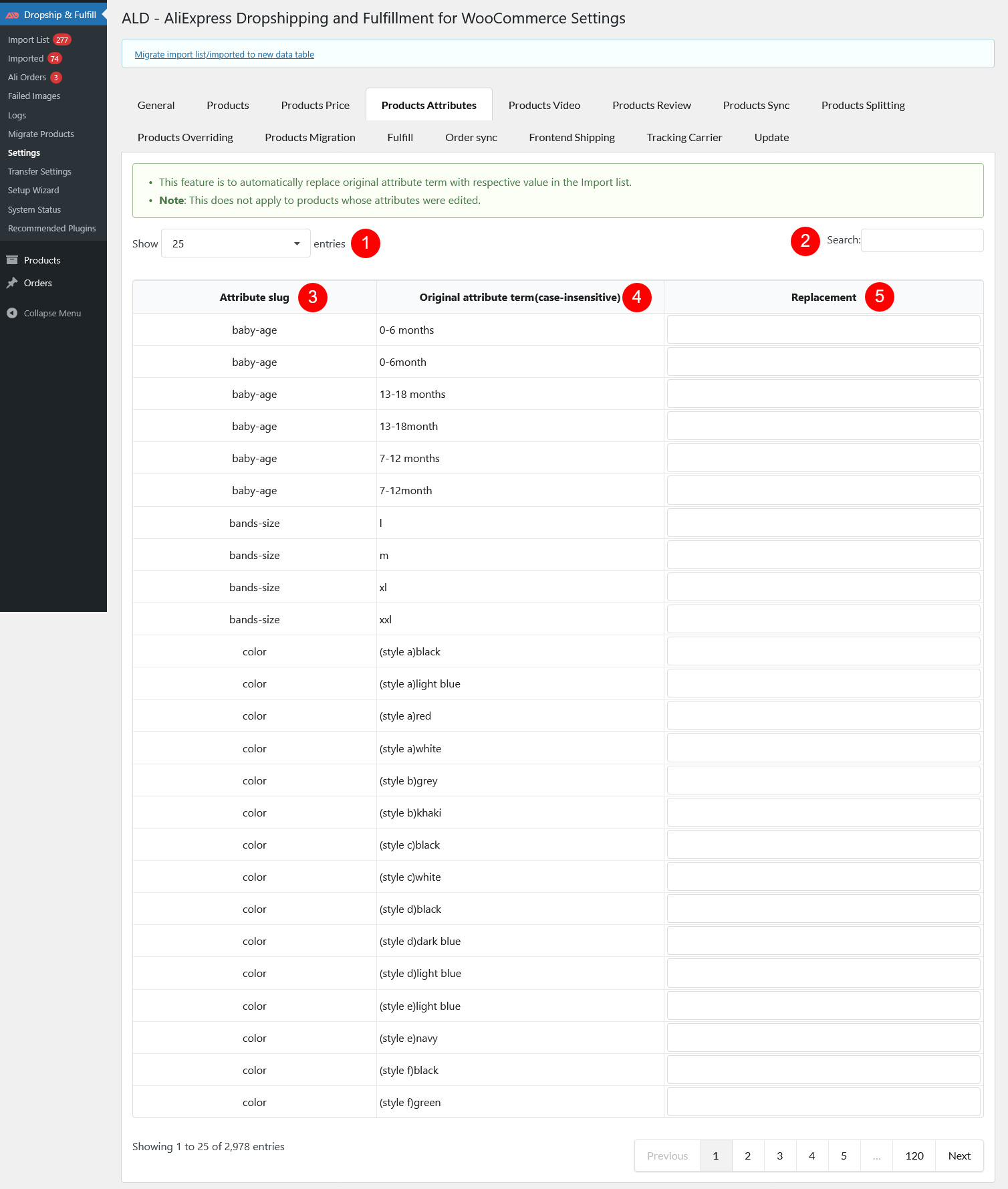 4. Import All: Click to import all products on the current Import List page to your WooCommerce (only in the current page, you need to move to the next page and hit this button again to keep importing). This button doesn’t work for all items on all pages of the Import List page.
