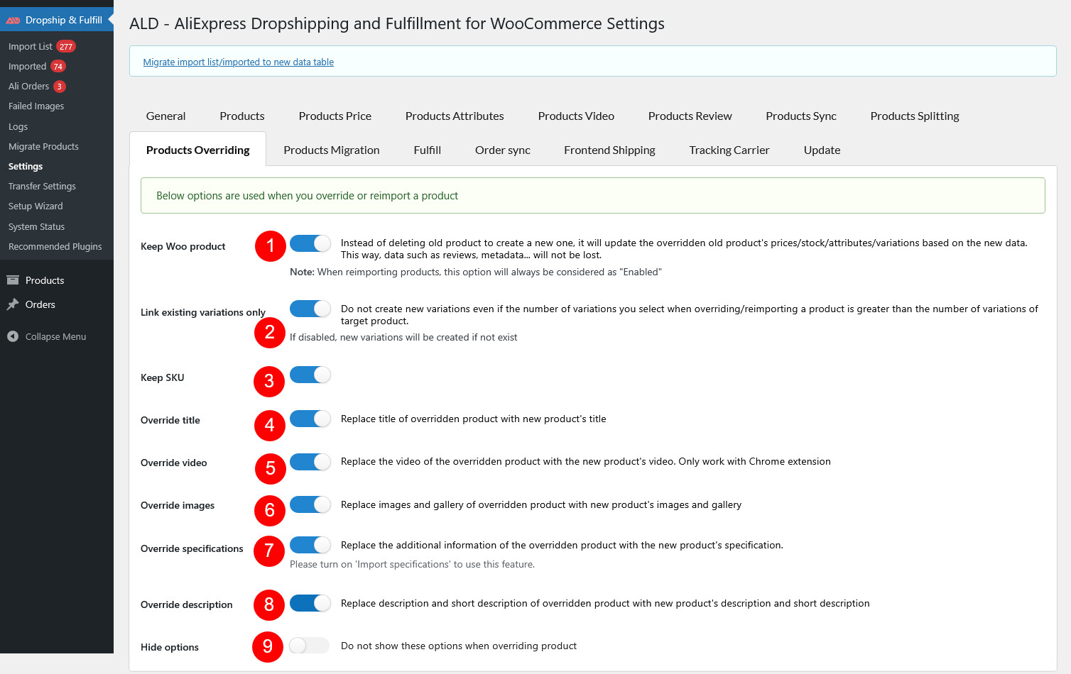 8. Override description: Enable if you want automatically set to replace description of overridden product with new product’s description and short description