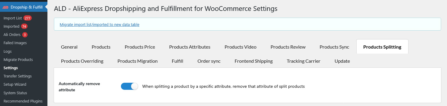 Automatically remove attribute: When splitting a product by a specific attribute in the Variations tab in Import List, remove that attribute of split product. E.g. You split product by Color, and you have 2 products in different colors – Black and Burgundy – each has full 4 sizes. The “Color” attribute will be removed in the 2 new products.