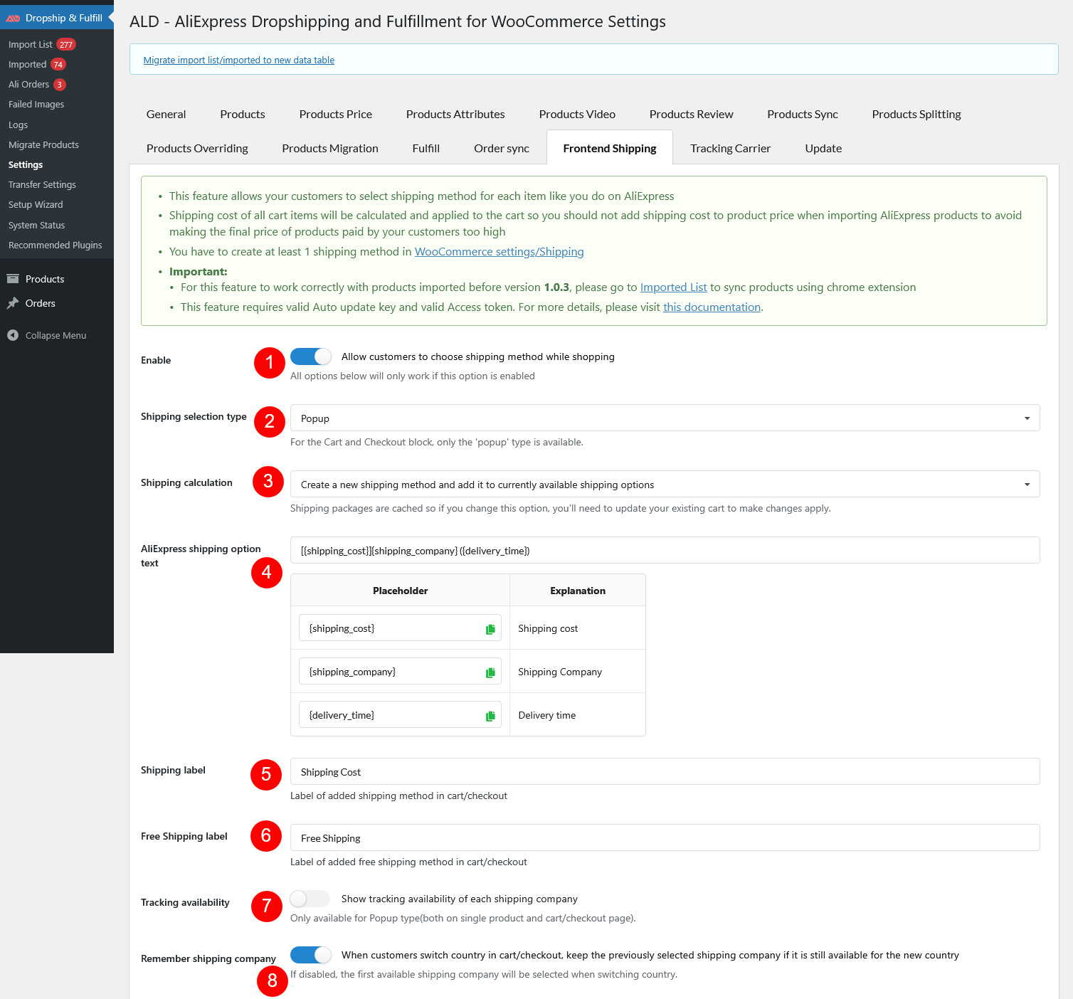Note: This “Calculate Aliexpress shipping cost of all items in cart and add the cost to all currently available shipping option” option doesn’t work if WooCommerce shipping method is “Free shipping”. Instead, you can try using “Flat rate” with “0” shipping cost.