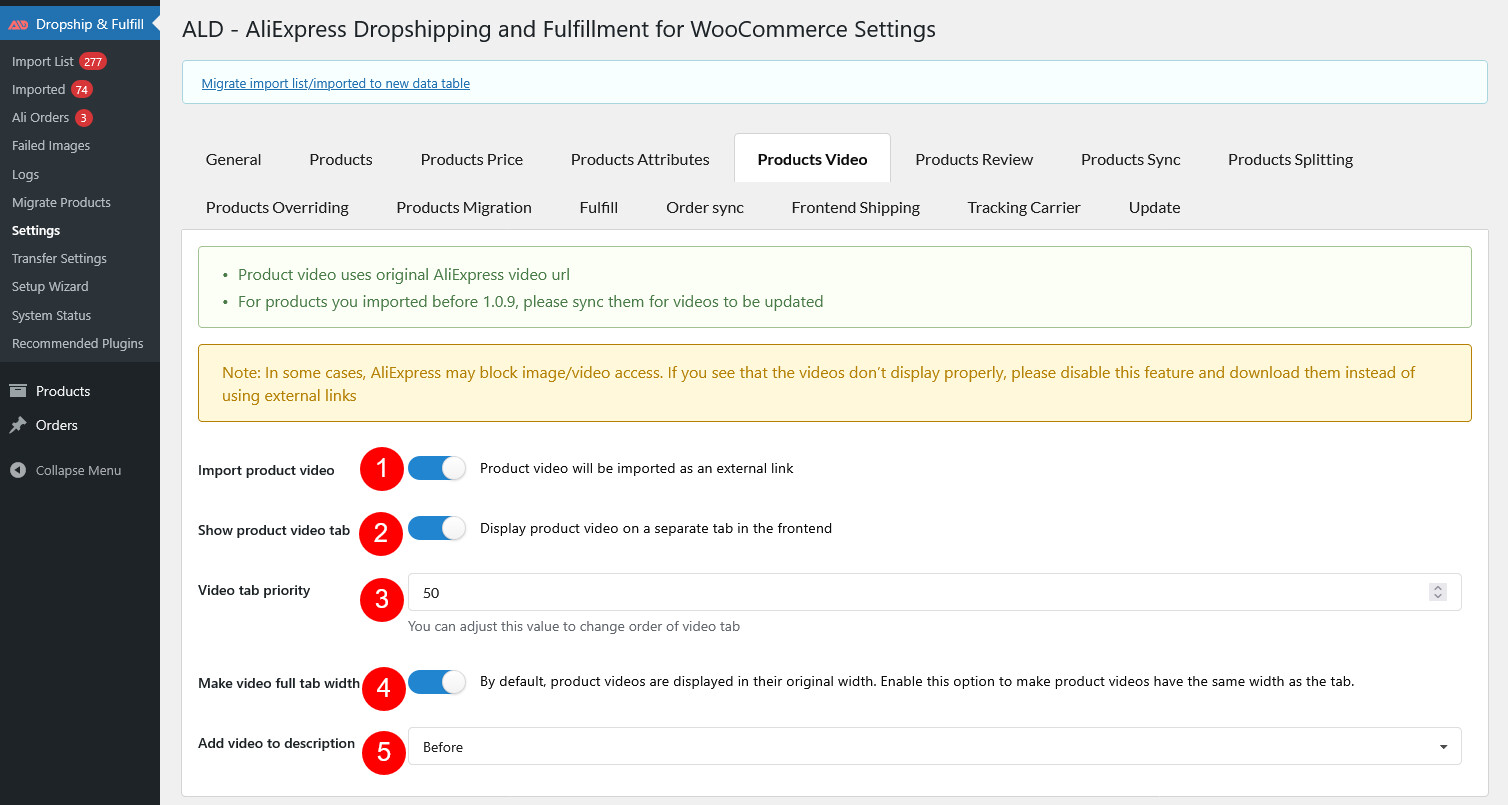 1. Action on the product video tab: You can choose to show or hide the product video on each single product page.