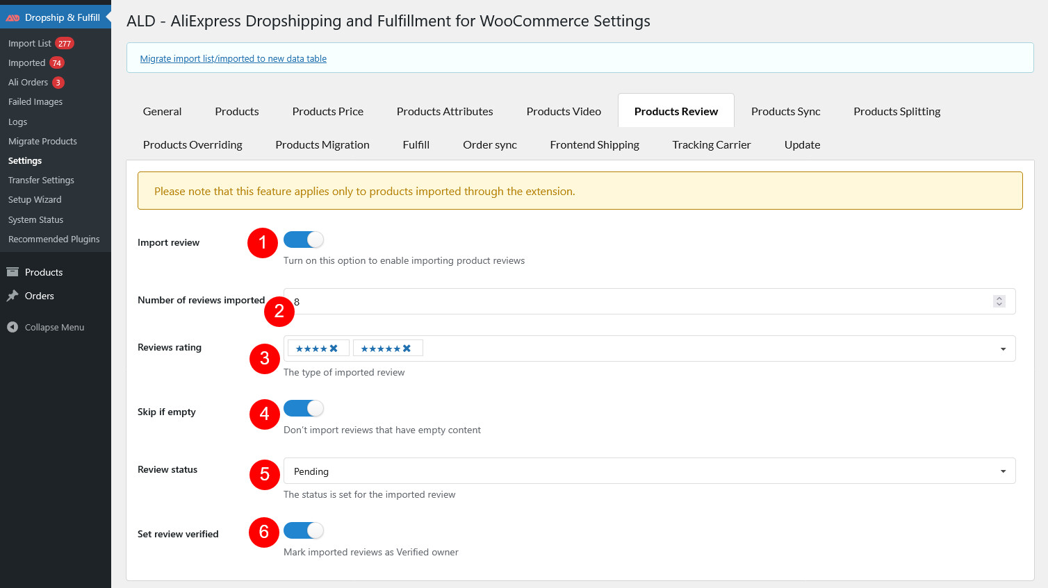 Manage how product reviews are imported during product importation. You can set the number of reviews, filter by rating, skip empty ones, and define their status and verification in WooCommerce.