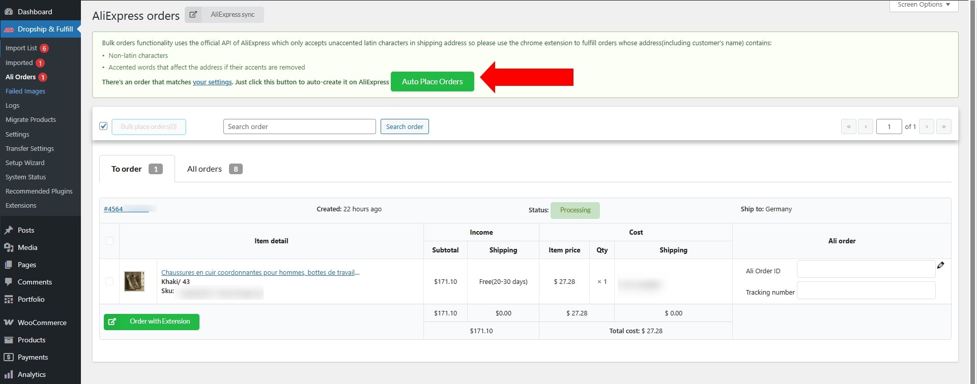Step 2: Click on the Order with Extension button to in the Ali Orders section. Or you can go to Order admin in WooCommerce to fulfill order by this way.