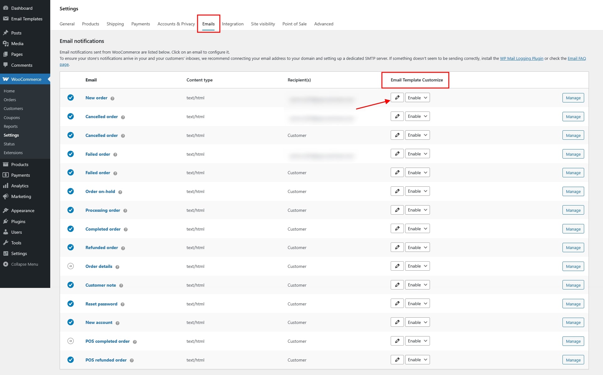 Go to WooCommerce >> Settings >> Emails. In this email list, you’ll see the “Email Template Customizer” column.