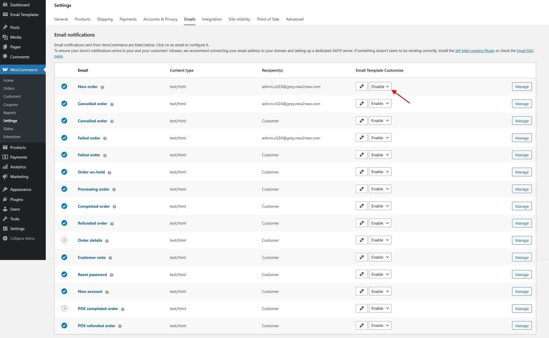 You’ve activated the plugin, but for some specific email types, you don’t want to use the customized template, but the default email of WooCommerce instead. In that case, you can disable the template of WooCommerce Email Template Customizer in WooCommerce Emails settings for that email type.