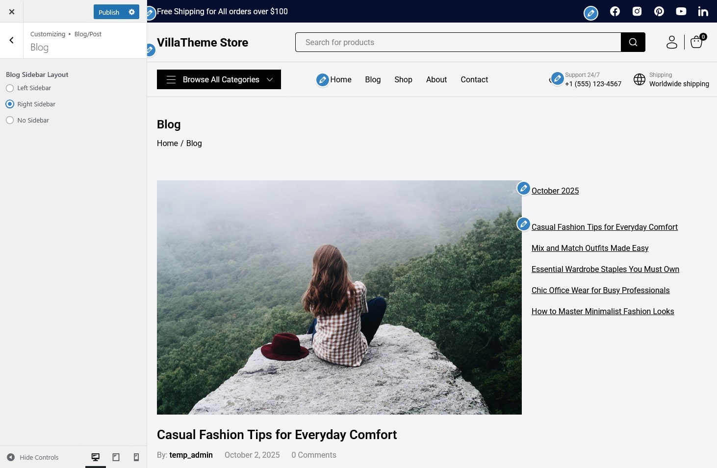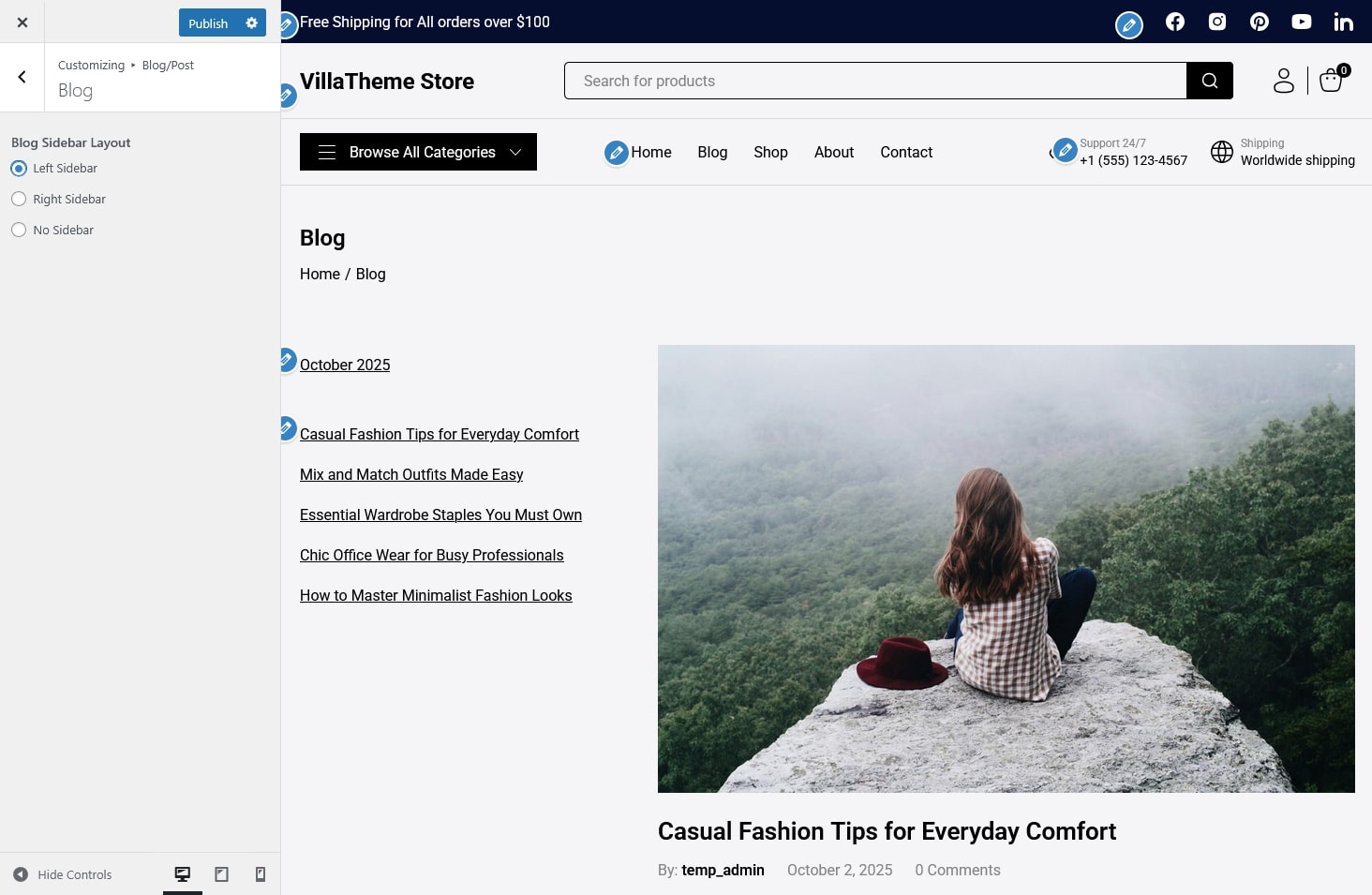 - Post Sidebar Layout: Choose where the sidebar appears on individual post pages – Right, Left, or None – just like on the blog page.