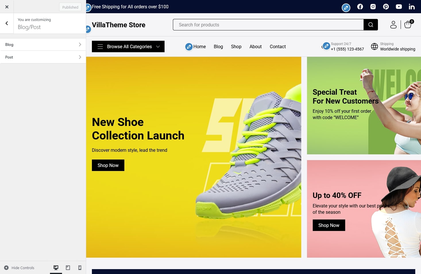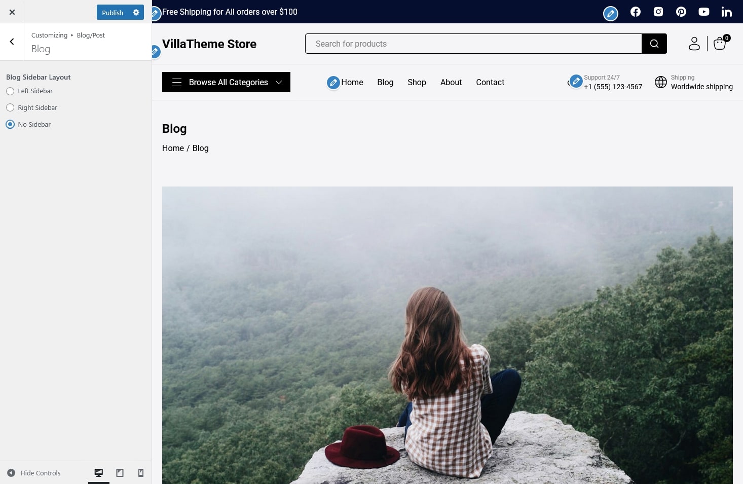 The Blog/Post settings control the layout and display options for both the Blog page (which lists your posts) and the Single Post page (individual articles). You can access these options from Appearance → Customize → Blog/Post.