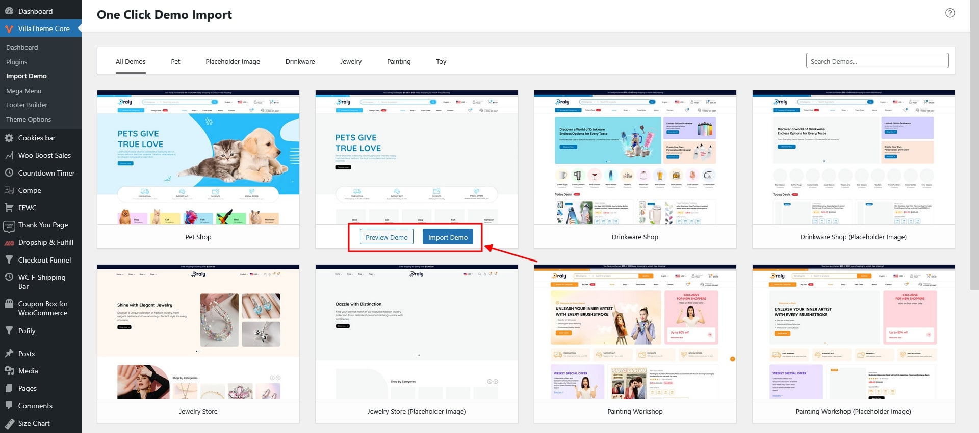 Go to your WordPress Dashboard > VillaTheme Core > Import Demo. Choose a demo you want to import. Hover over the demo preview and click Import (or Preview Demo if you want to see it first).