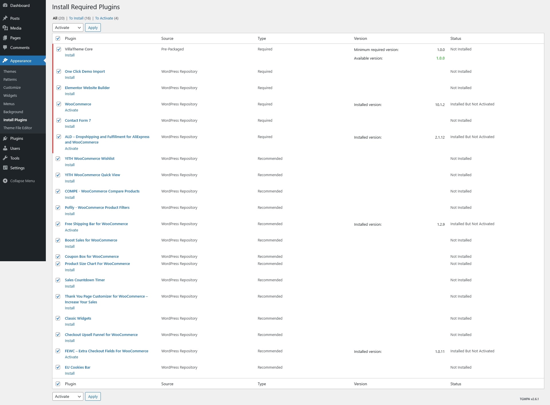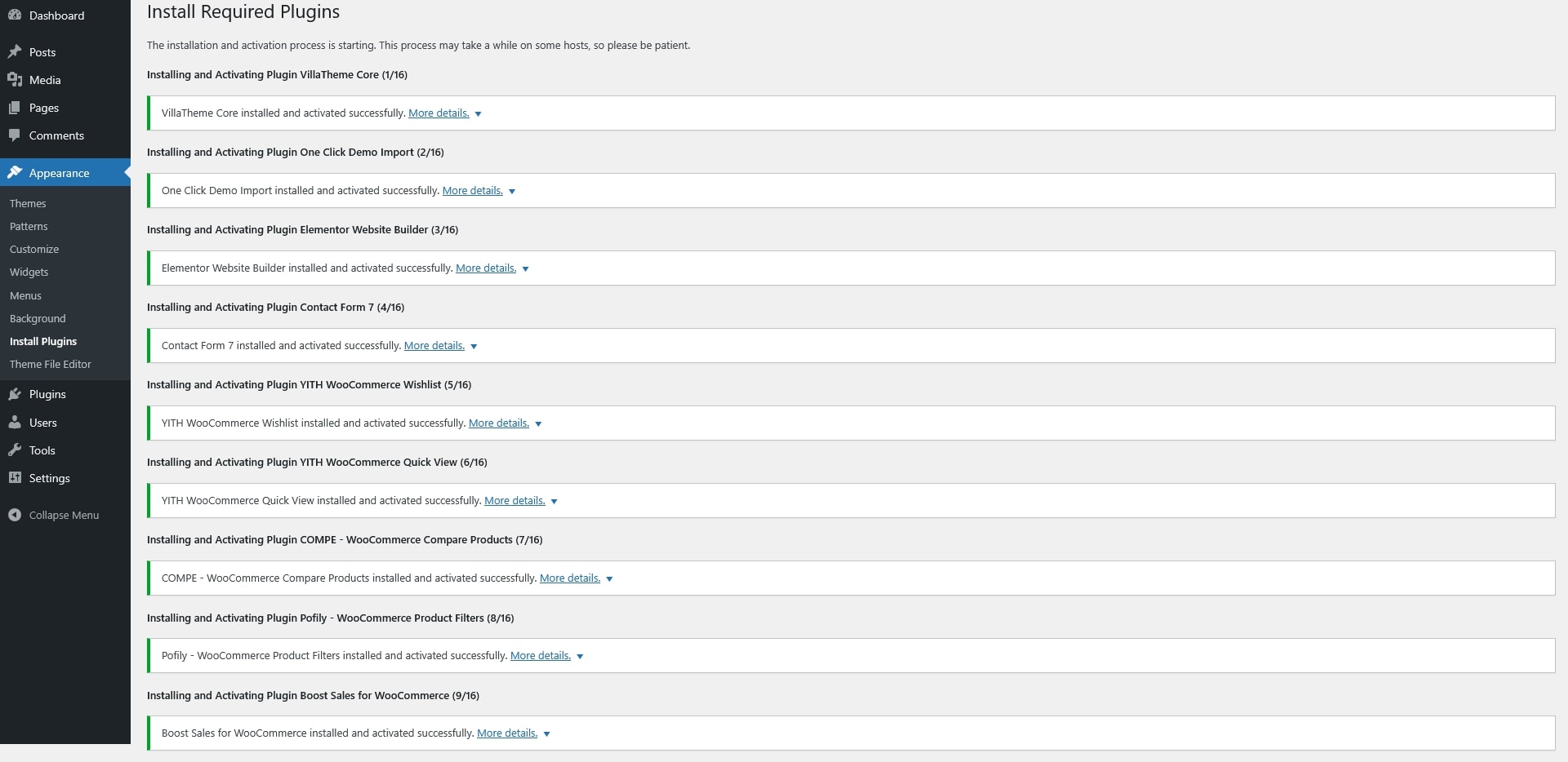 After installing and activating the theme, you’ll need to install the required (and optionally recommended) plugins for full functionality. Make sure all required plugins are activated before importing demo content to ensure everything works correctly.