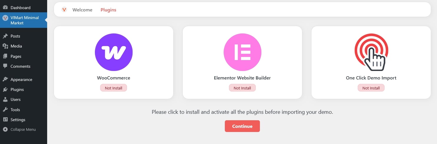 Click “Continue” on each prompt to install and activate all required and recommended plugins.