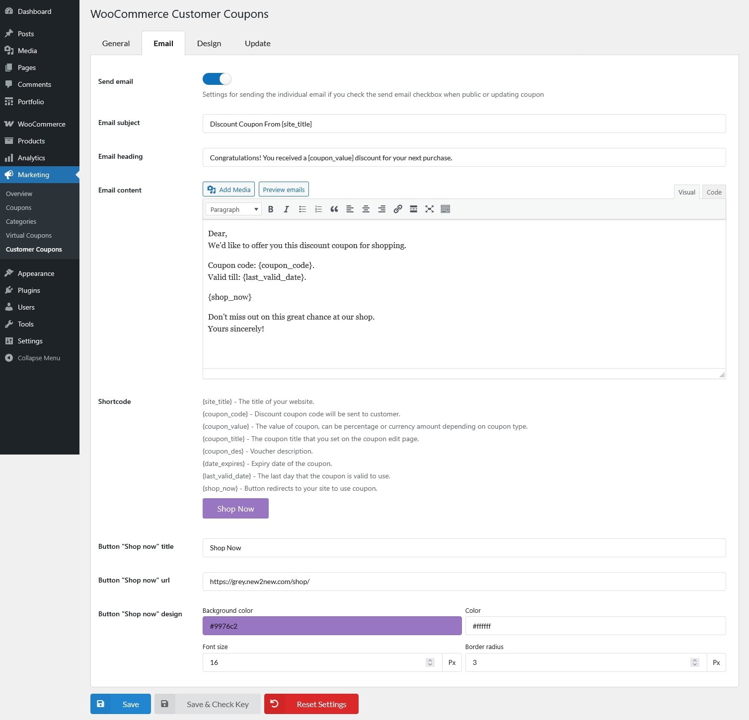 - {shop_now} – Button redirects to your site to use coupon, includes a live preview displayed directly below its placeholders.