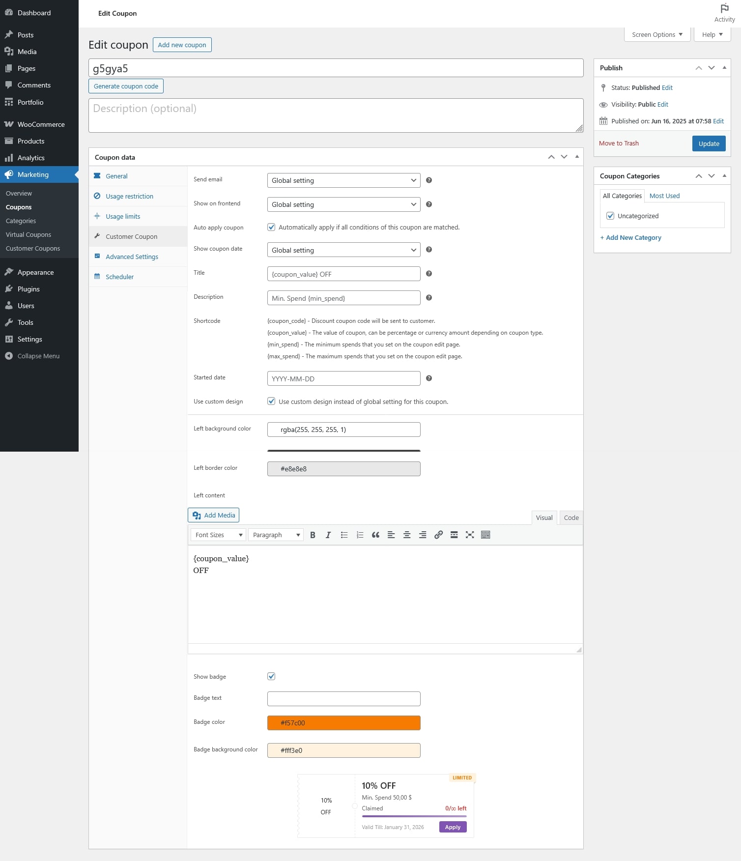 - Use custom design: Use a custom design for this coupon instead of the global design settings. Configure the options below to see the updates reflected in the preview