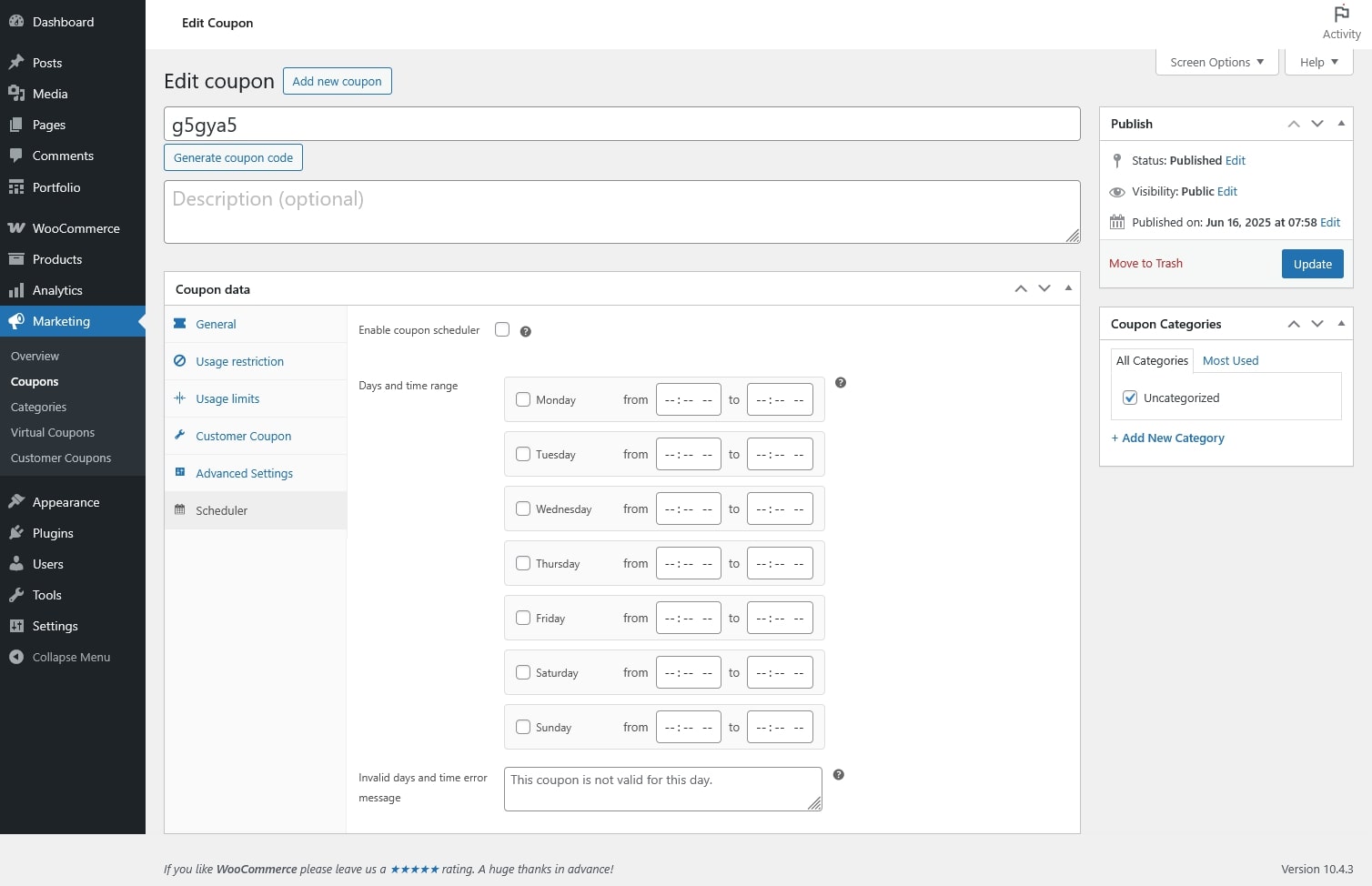 - Invalid days and time error message: Custom message shown to customers when the coupon is not valid due to the schedule.