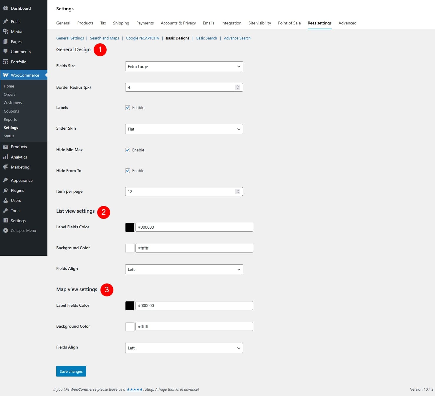 Go to Dashboard > WooCommerce > Settings > Rees settings > Search and Maps