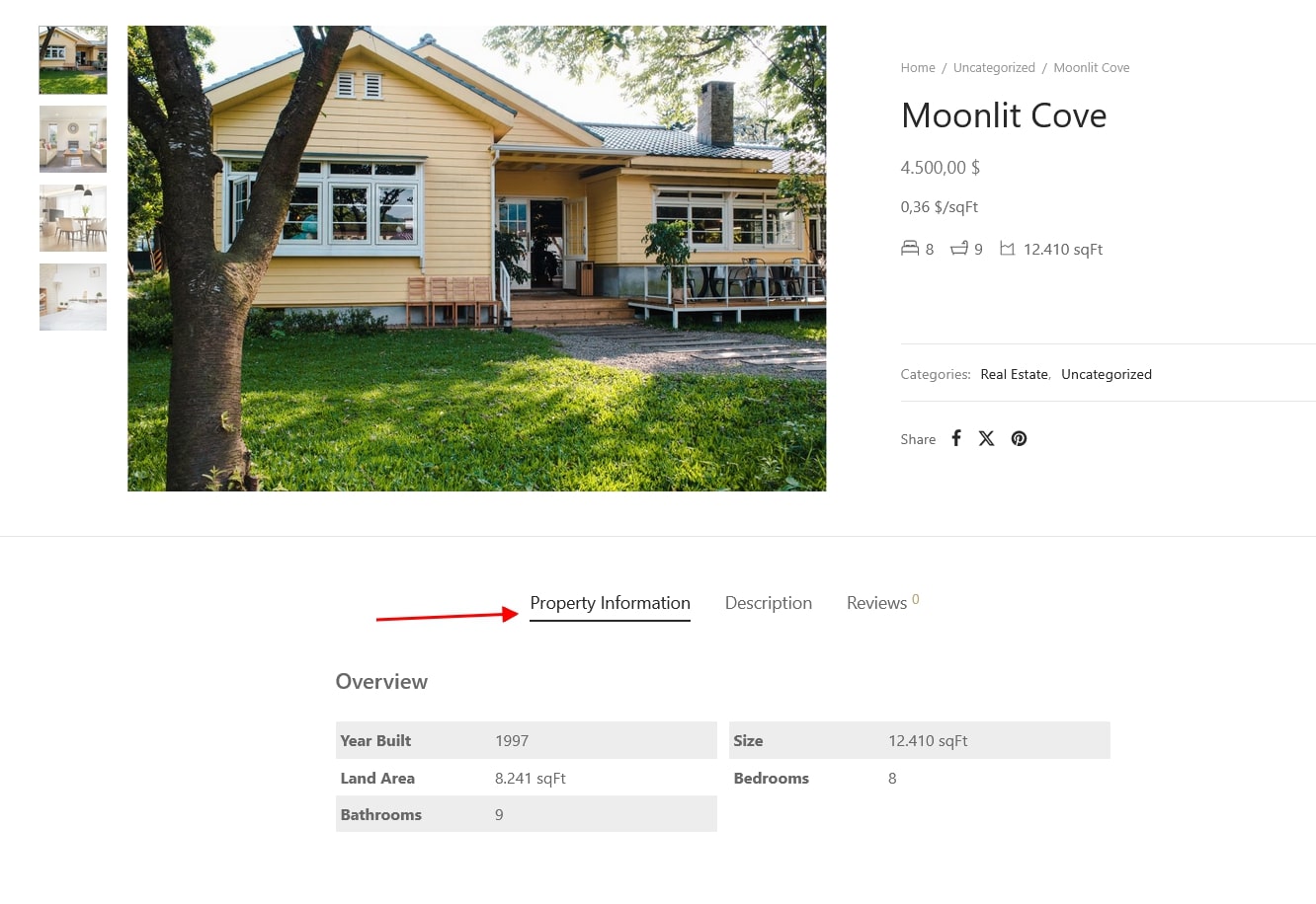 Go to the Product editing page > In the Product data > General: Furnish information about this real estate including price, type, size, land area, number of rooms, bedrooms, bathrooms, year built, and additional details