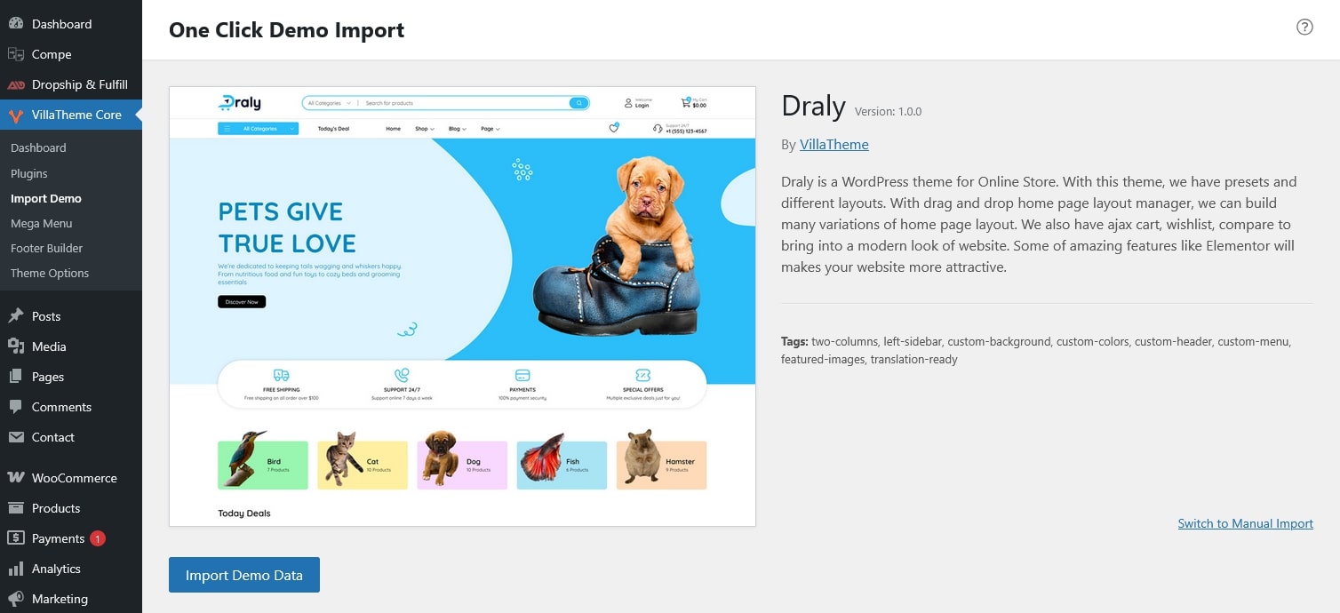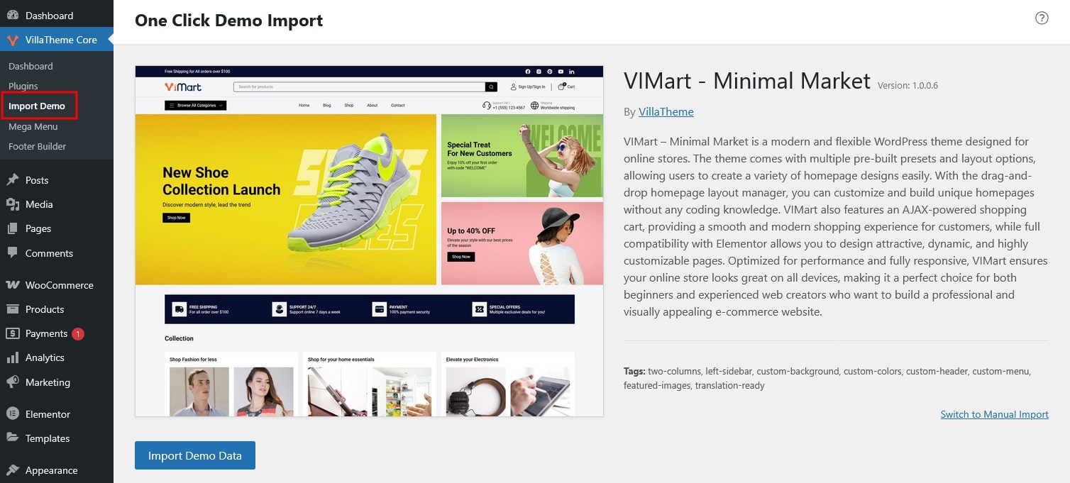 Unlocks the ability to import predefined demo content to quickly set up the site layout and design. Without VillaTheme Core, only Option 2: Import Manually is available
