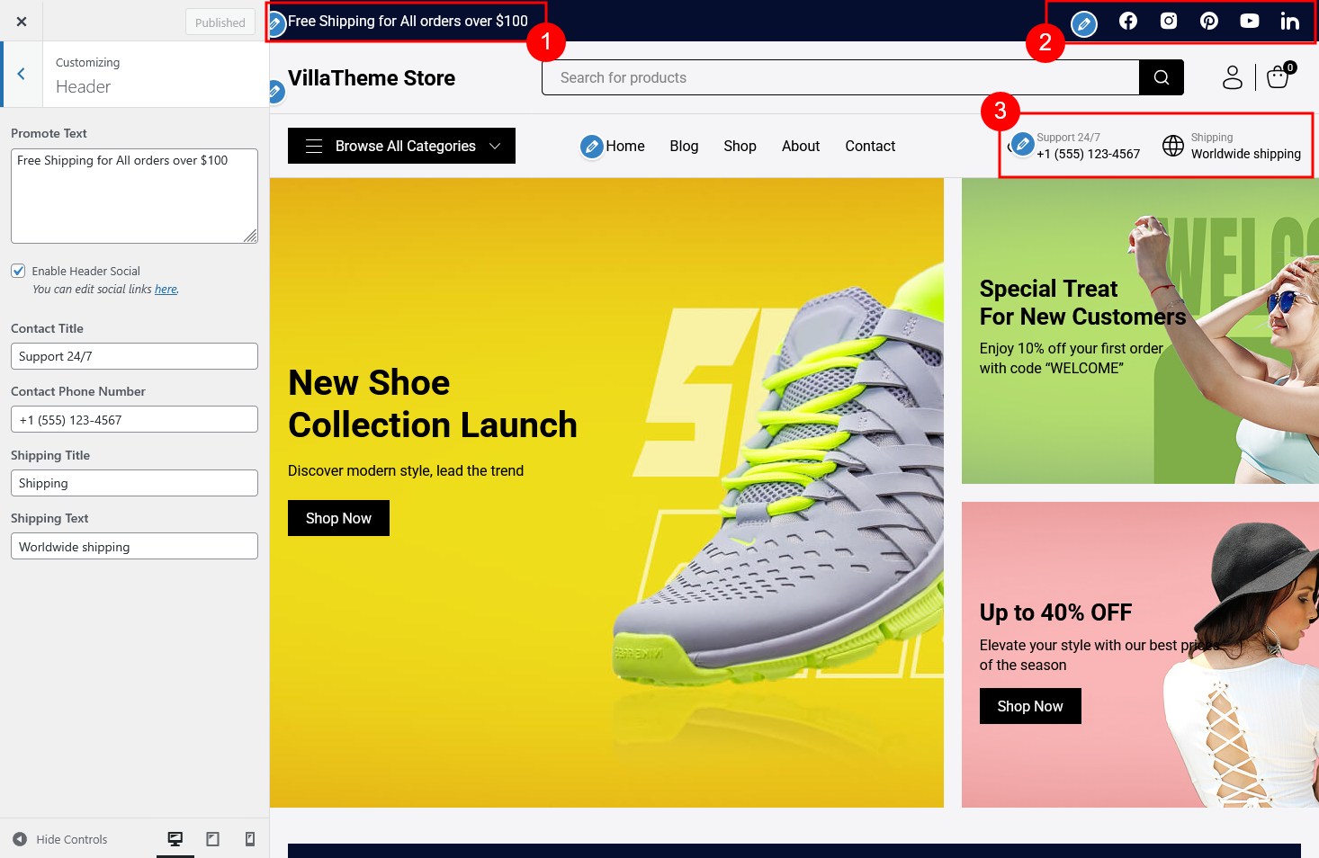 The Header section allows you to display key store information such as promotions, contact details. Options included: