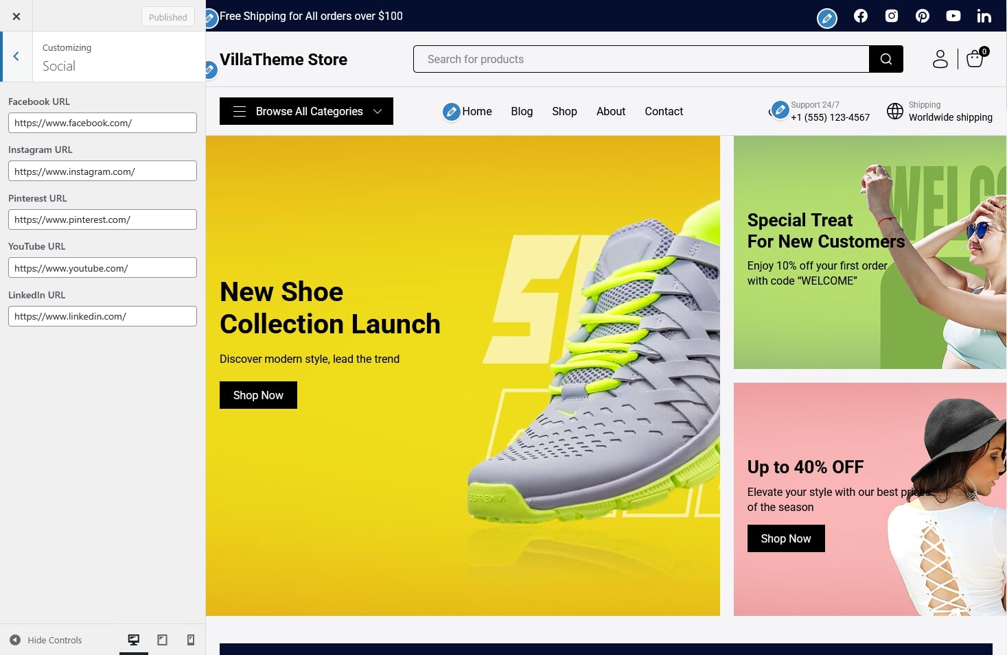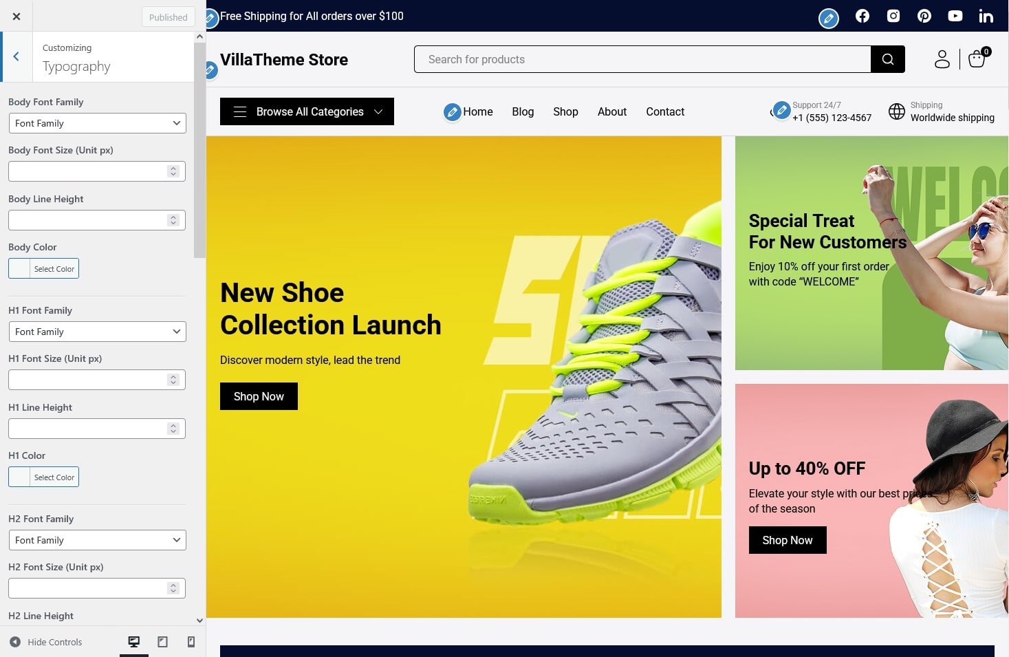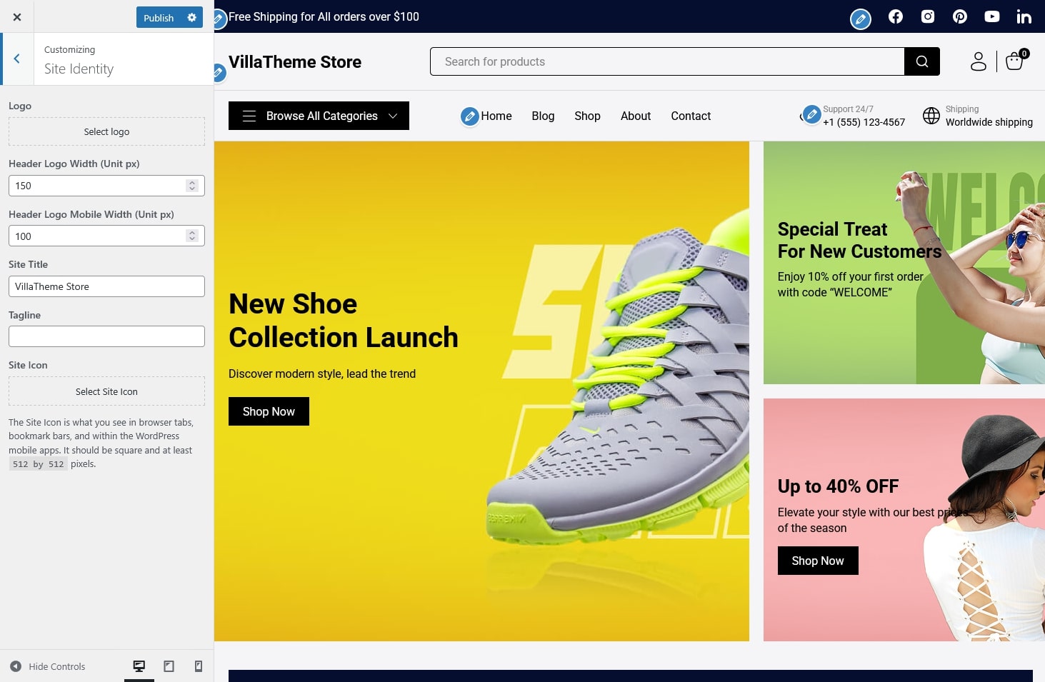 After importing the demo, you can personalize your website design and layout through the Customizer. This section allows you to adjust global styles, layout, and elements to match your brand, all in real time with live preview.