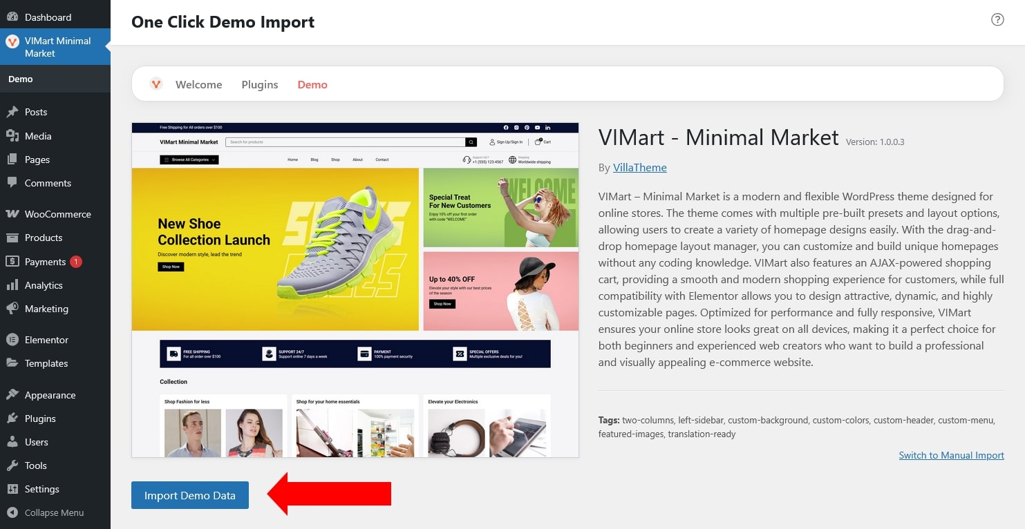Go to Dashboard → VIMart Minimal Market → Demo.