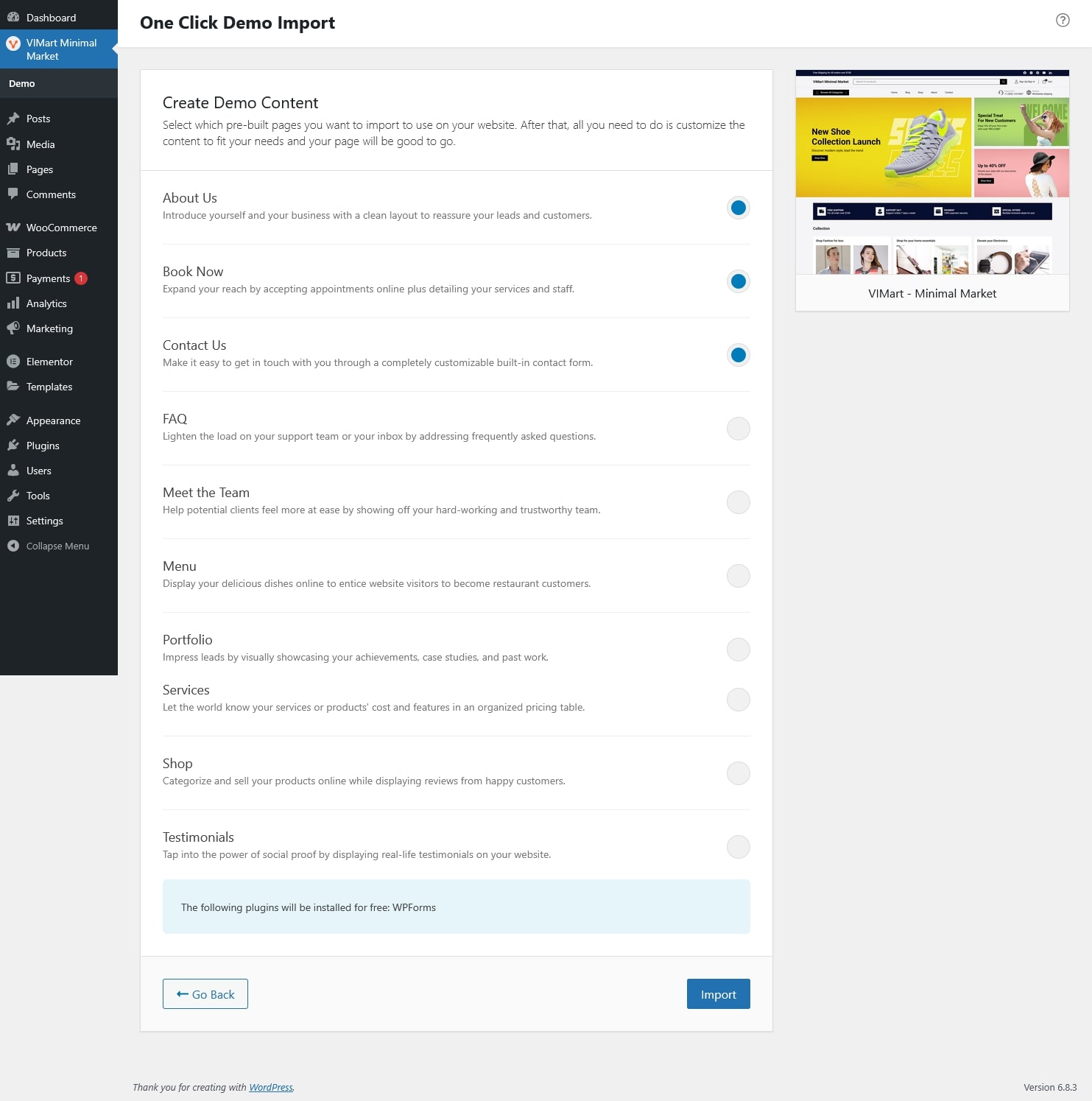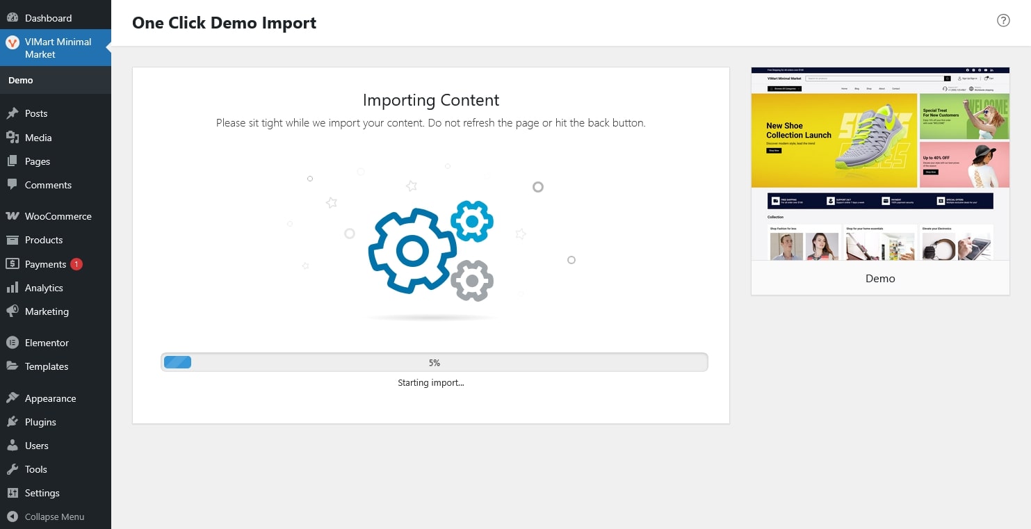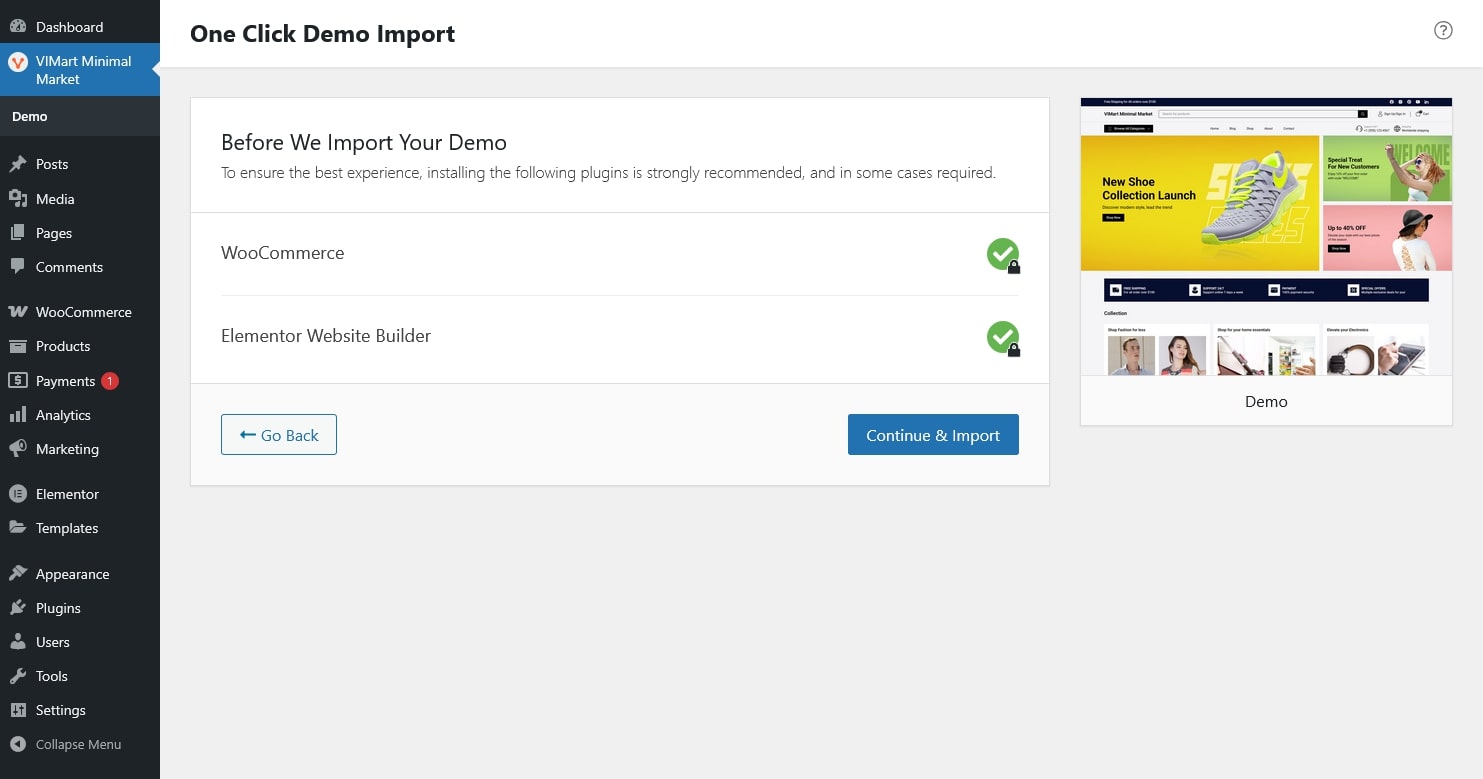 • Install the required plugins (WooCommerce, Elementor, and One Click Demo Import).