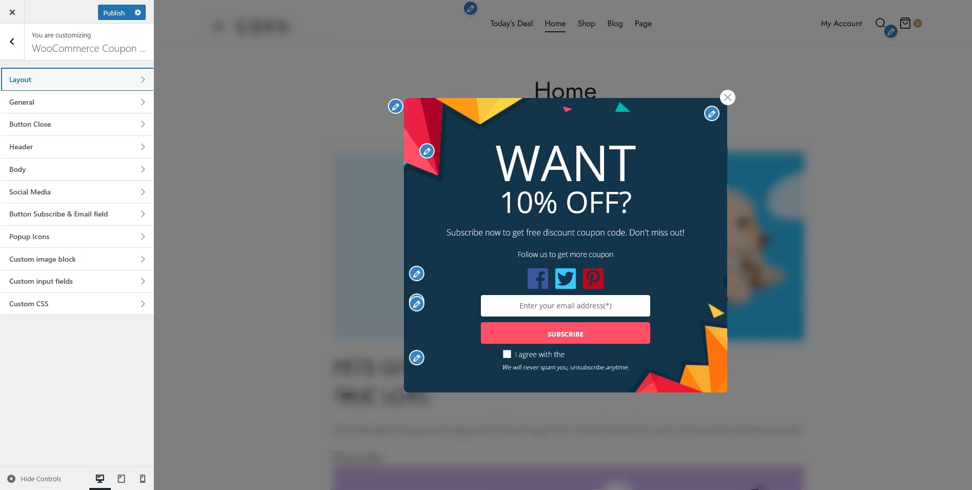 The front-end style of the Coupon Box pop-up to match your site’s style.