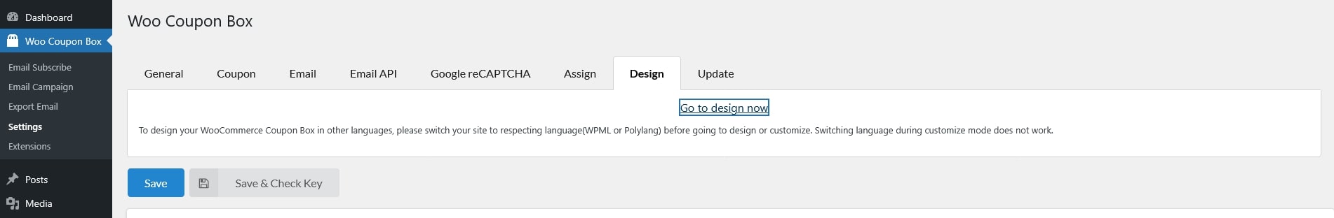 In the Design tab, click on Go to design now to go the Design page of WooCommerce Coupon Box.