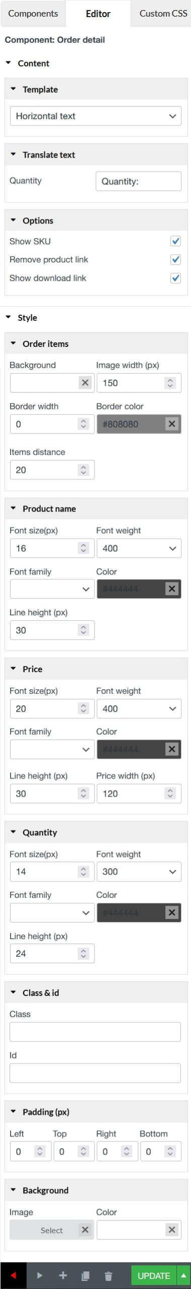 - Email Elements – Add different elements (Basic, Woocommerce and hooks) to your email template with full shopping information of WooCommerce and users’ information. The editing tab will show allow you to work directly on fast and effectively each element.