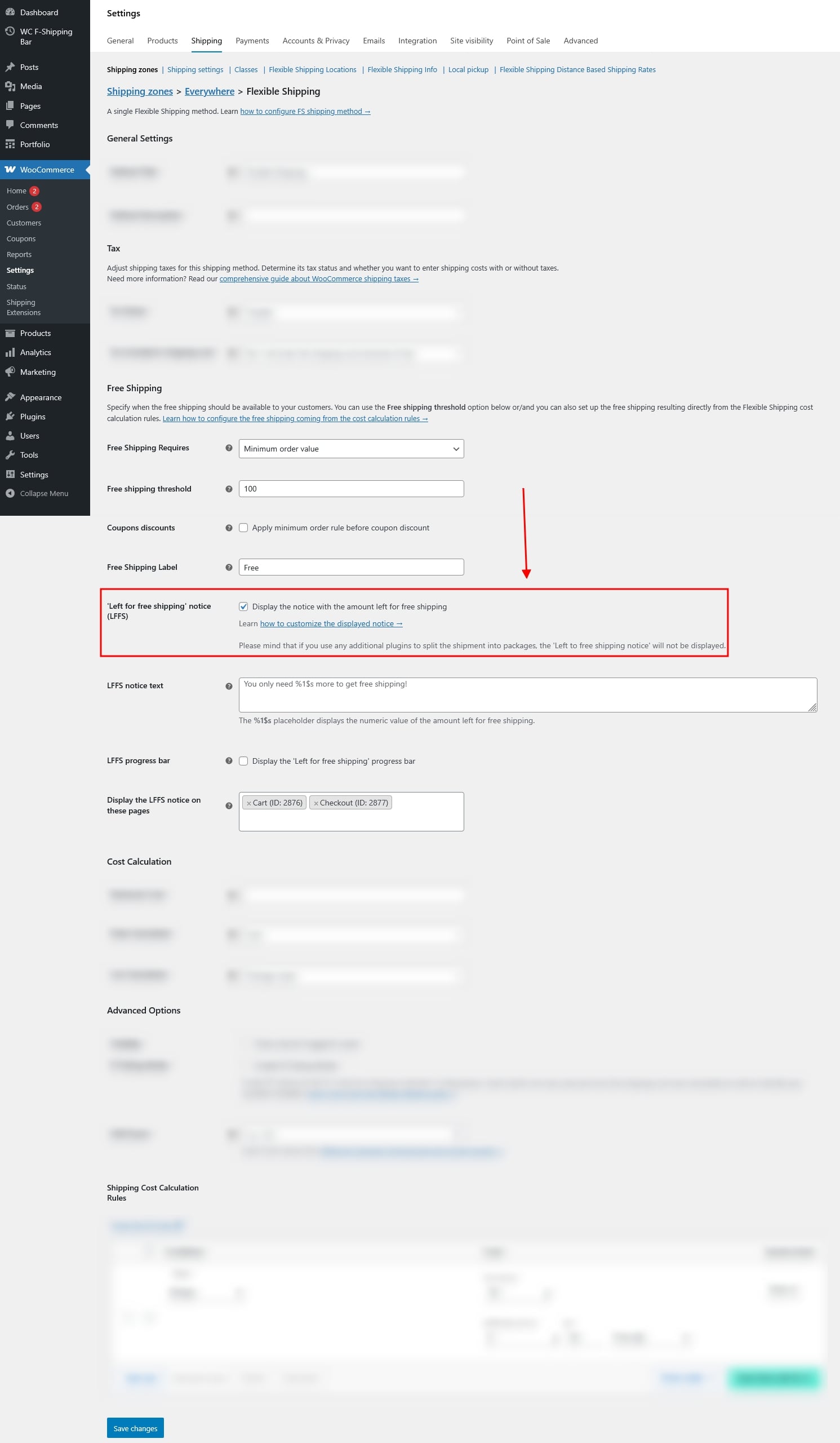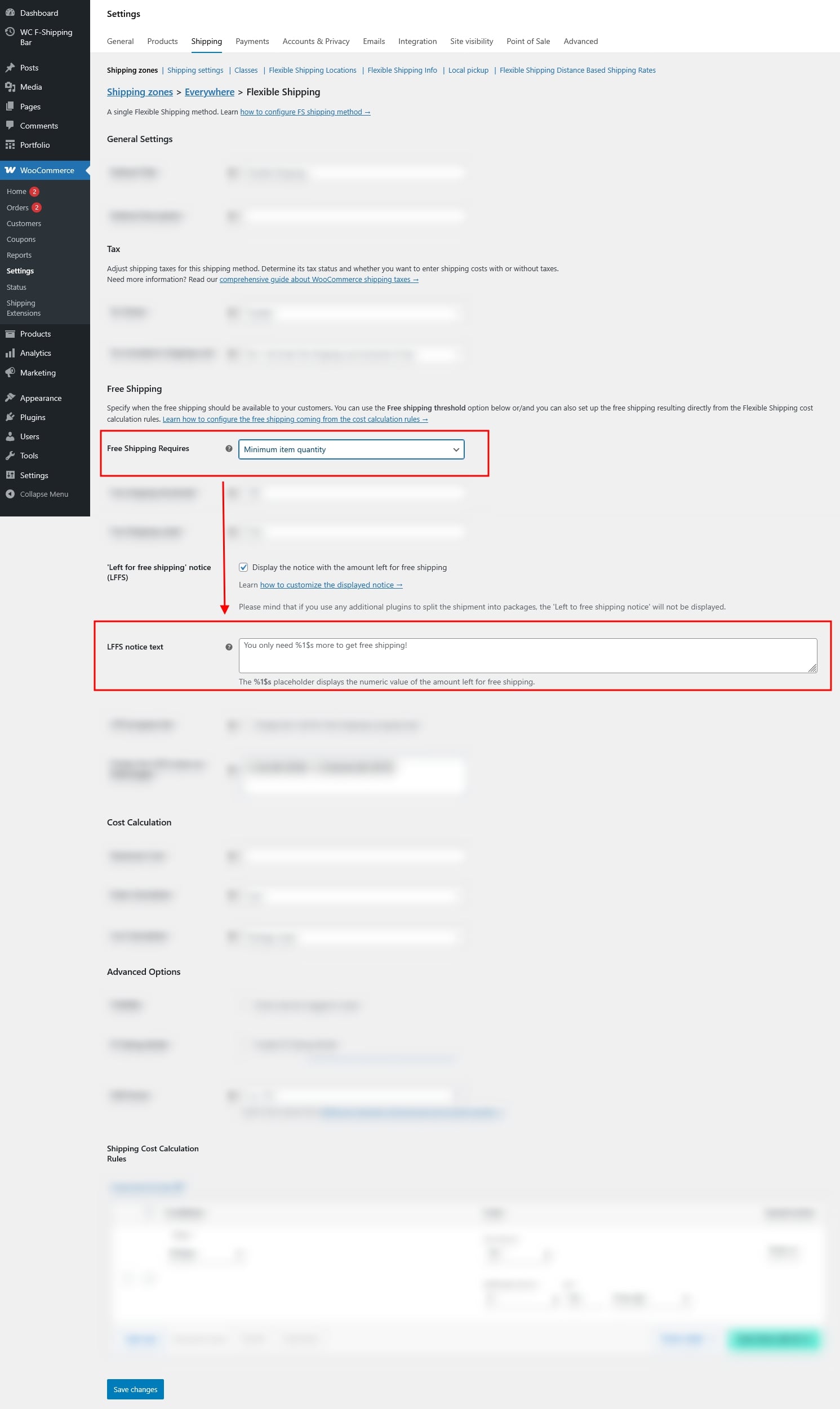 If your free-shipping rule depends on the number of items in the cart, the message shown in the plugin’s shipping bar will be taken from the “LFFS notice text” option in Flexible Shipping.