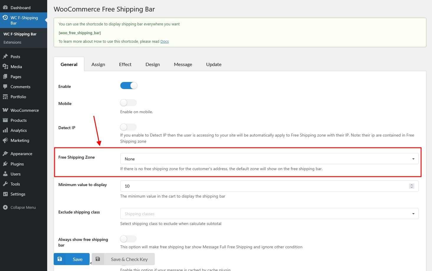 Step 4: In the Custom message option, and the free shipping bar shortcode there: [woo_free_shipping_bar]