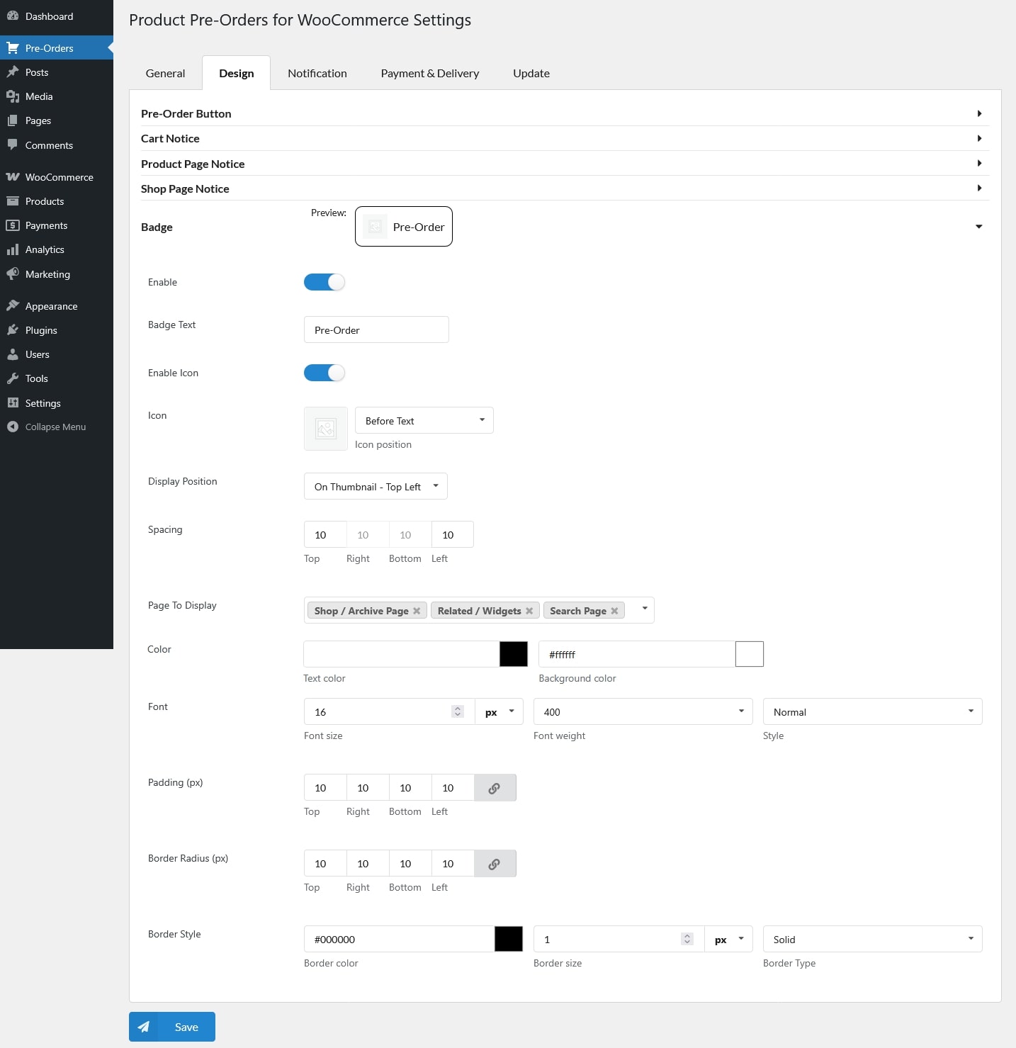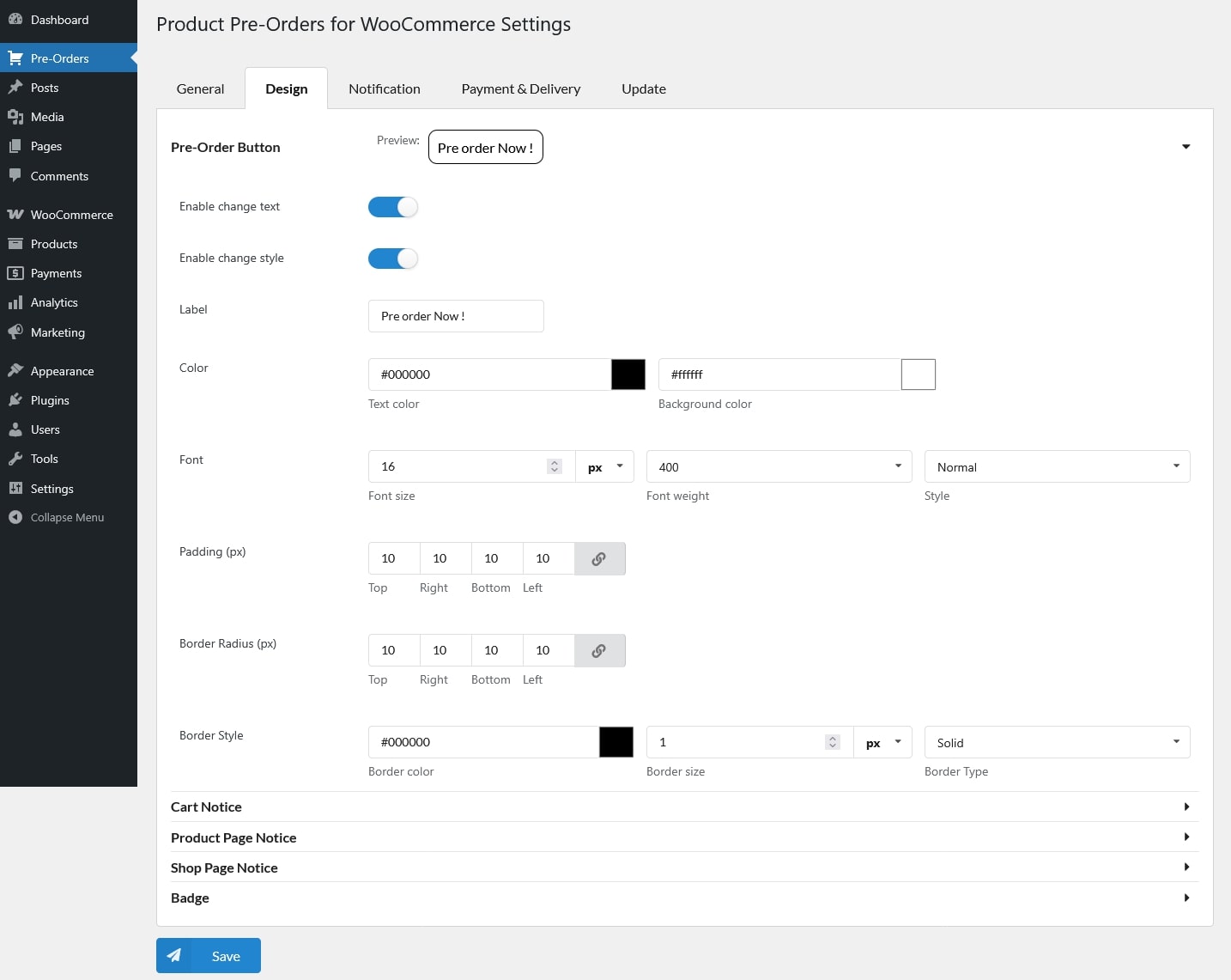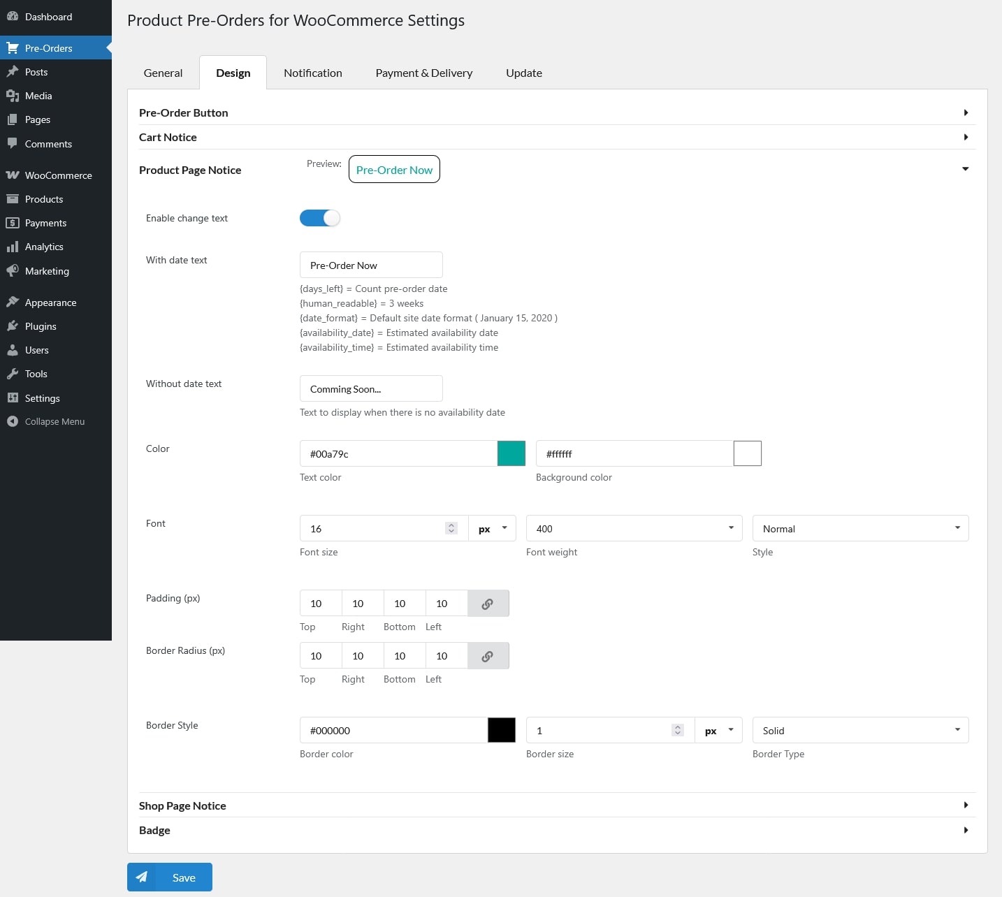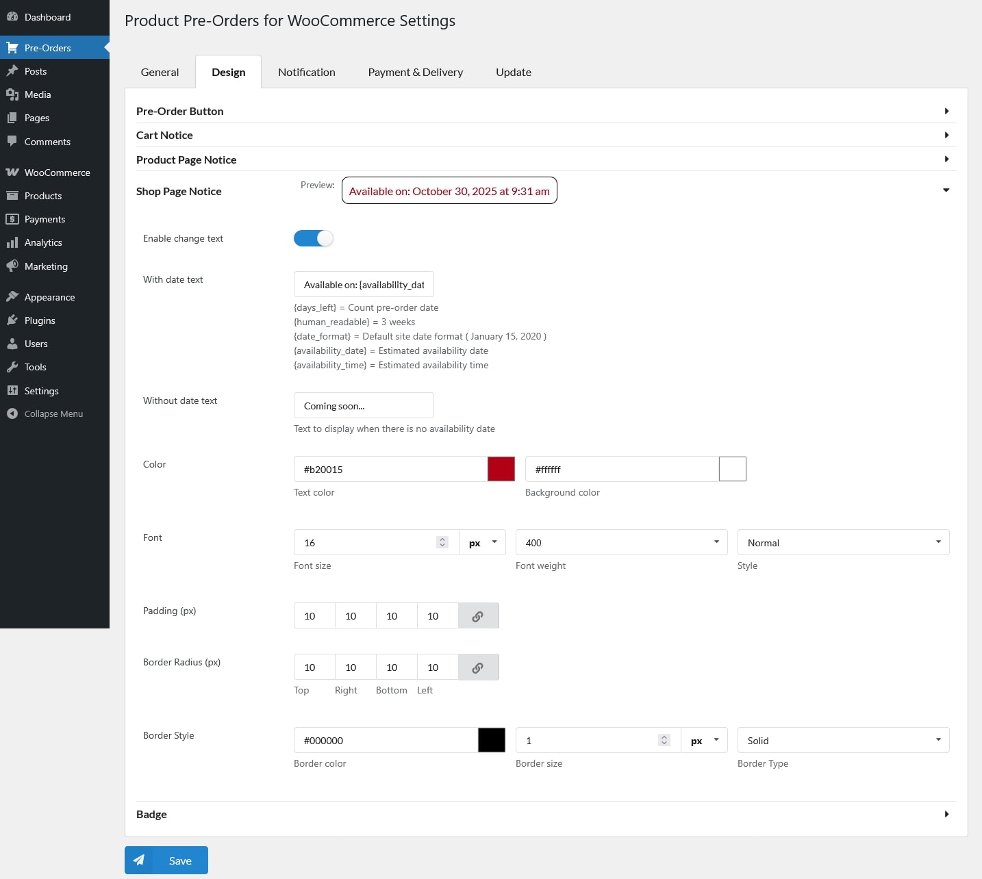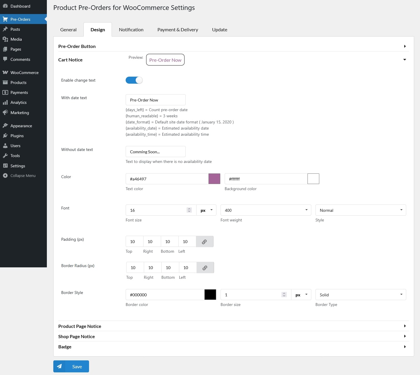 1. Navigate to WooCommerce → Pre-Order → Design settings.