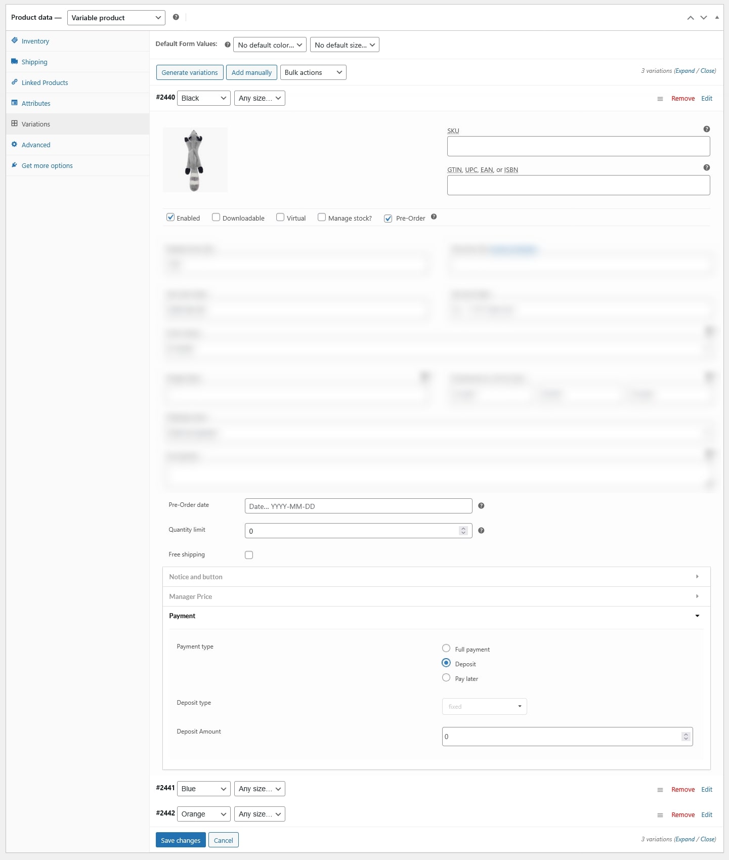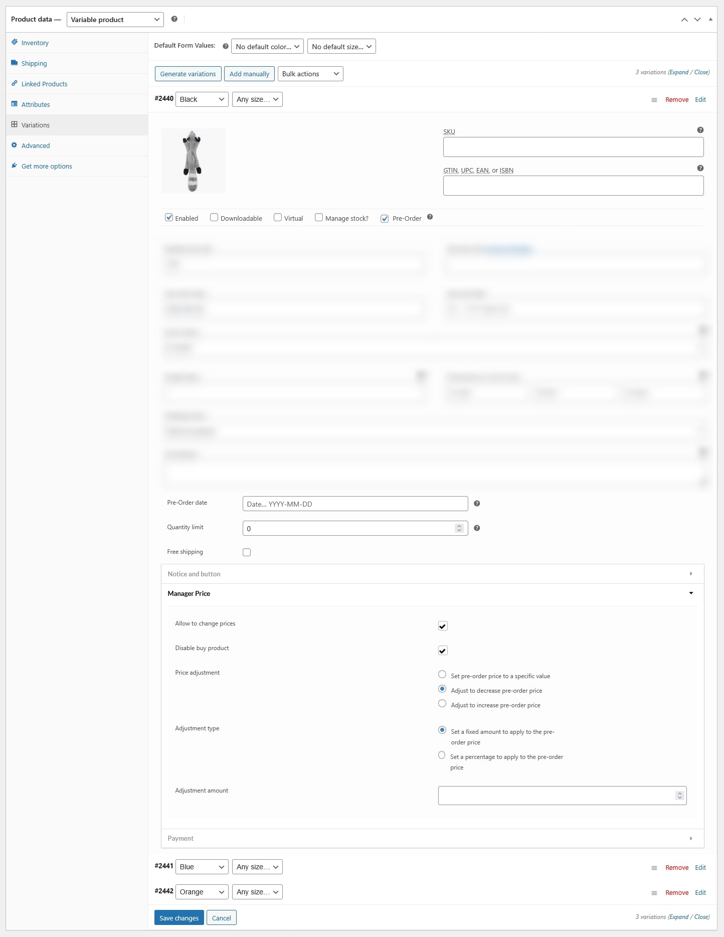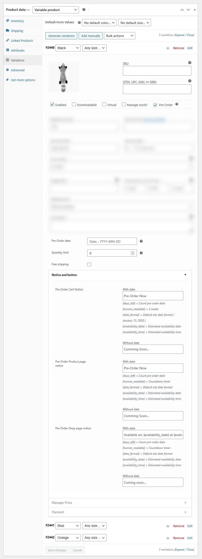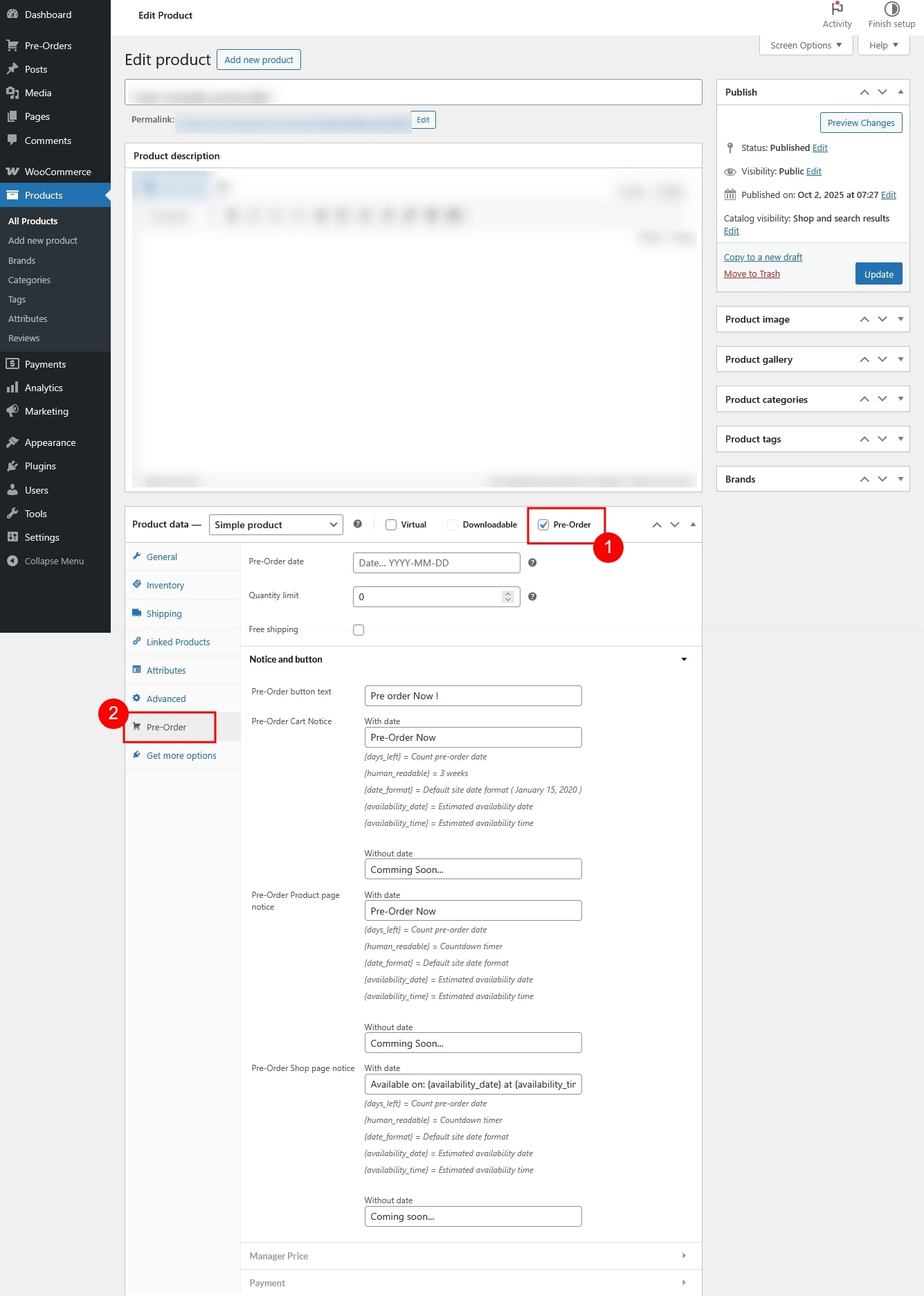 You can configure pre-order options directly from the product editing page in WooCommerce. The settings are available for both simple products and variable products, with the same configuration fields once enabled