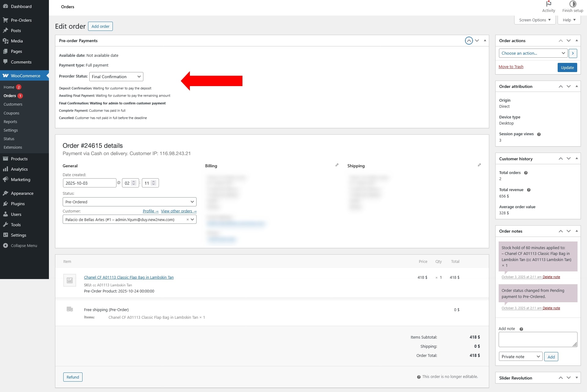 You can also manually update the pre-order payment status (for example, when a deposit is paid later or the final balance is collected).