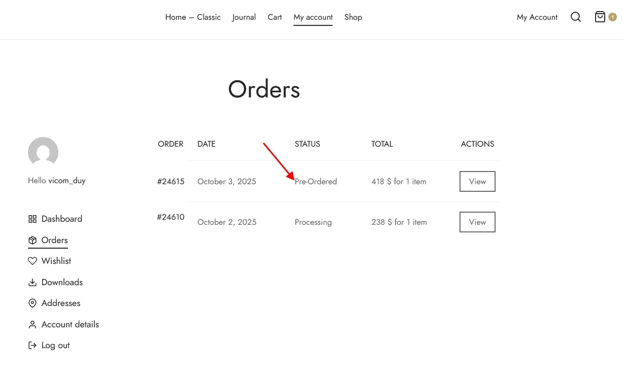 • Customers can track these orders under their My Account → Orders page, where the pre-order label will be visible.
