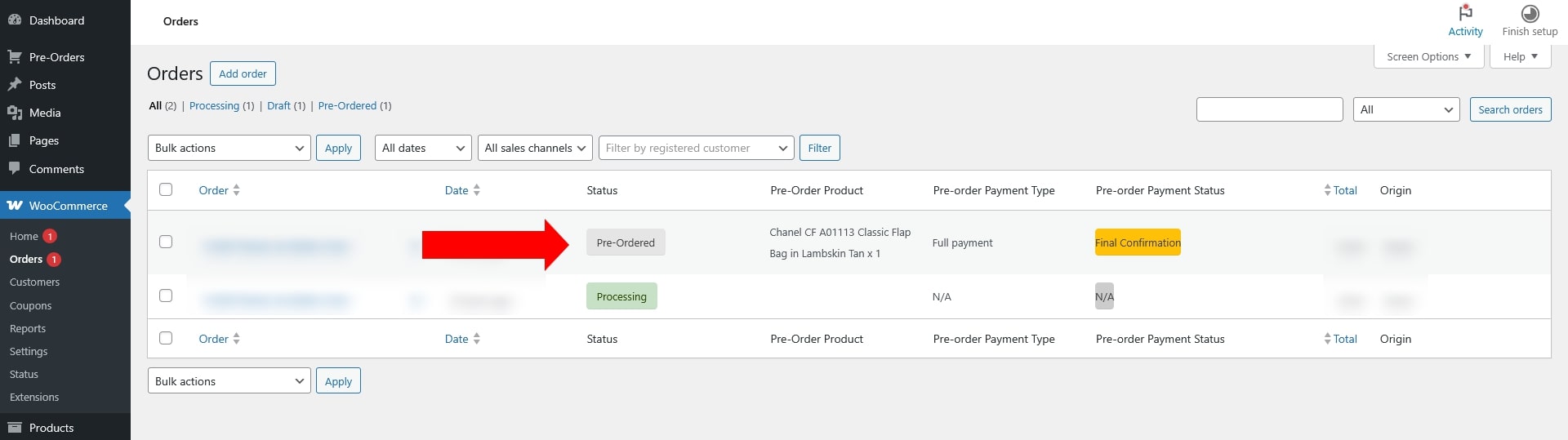 As the store admin, you can view all pre-order orders in WooCommerce → Orders.
