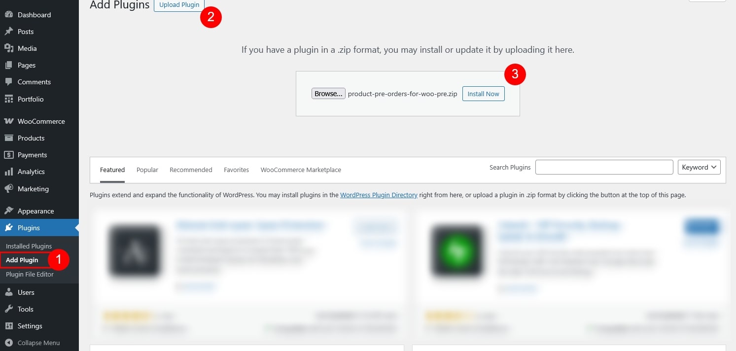 • Go to Plugin/Add New/Upload Plugin/Choose file/ select plugin zip file product-pre-orders-for-woo-pre.zip