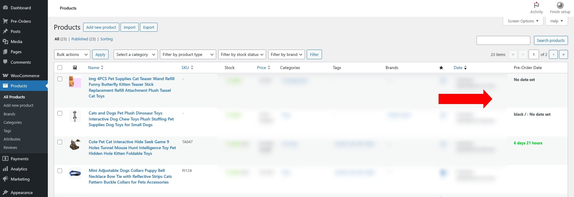 • All pre-order products will appear in your WooCommerce → Products list, just like regular products.
