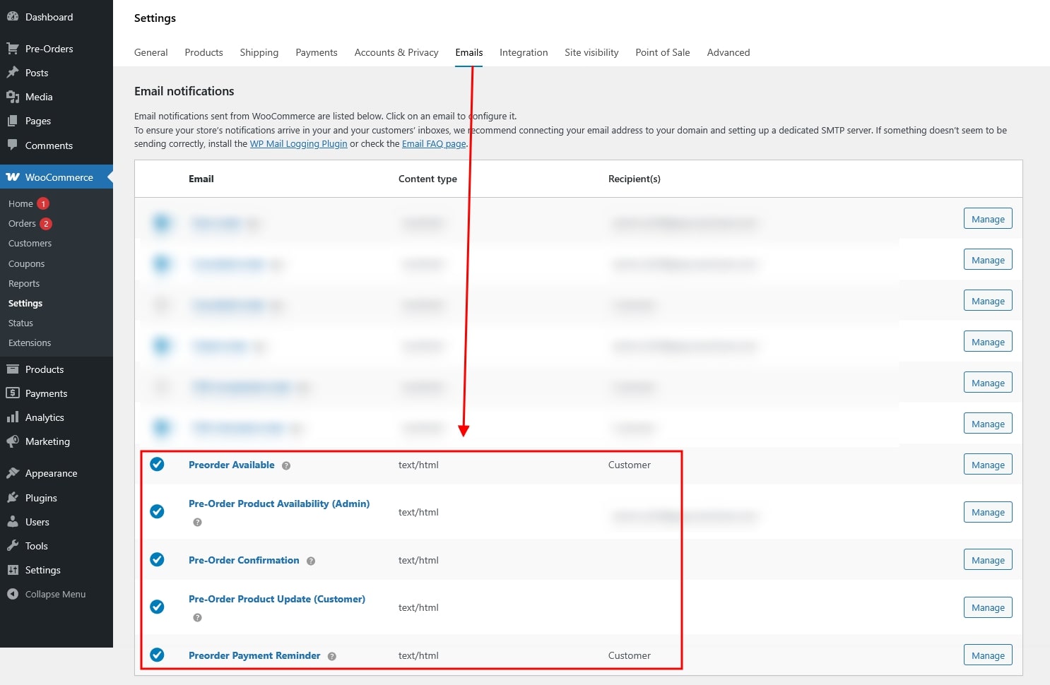 4. Use the Manage buttons (or go to WooCommerce → Settings → Emails) to edit and customize email templates.
