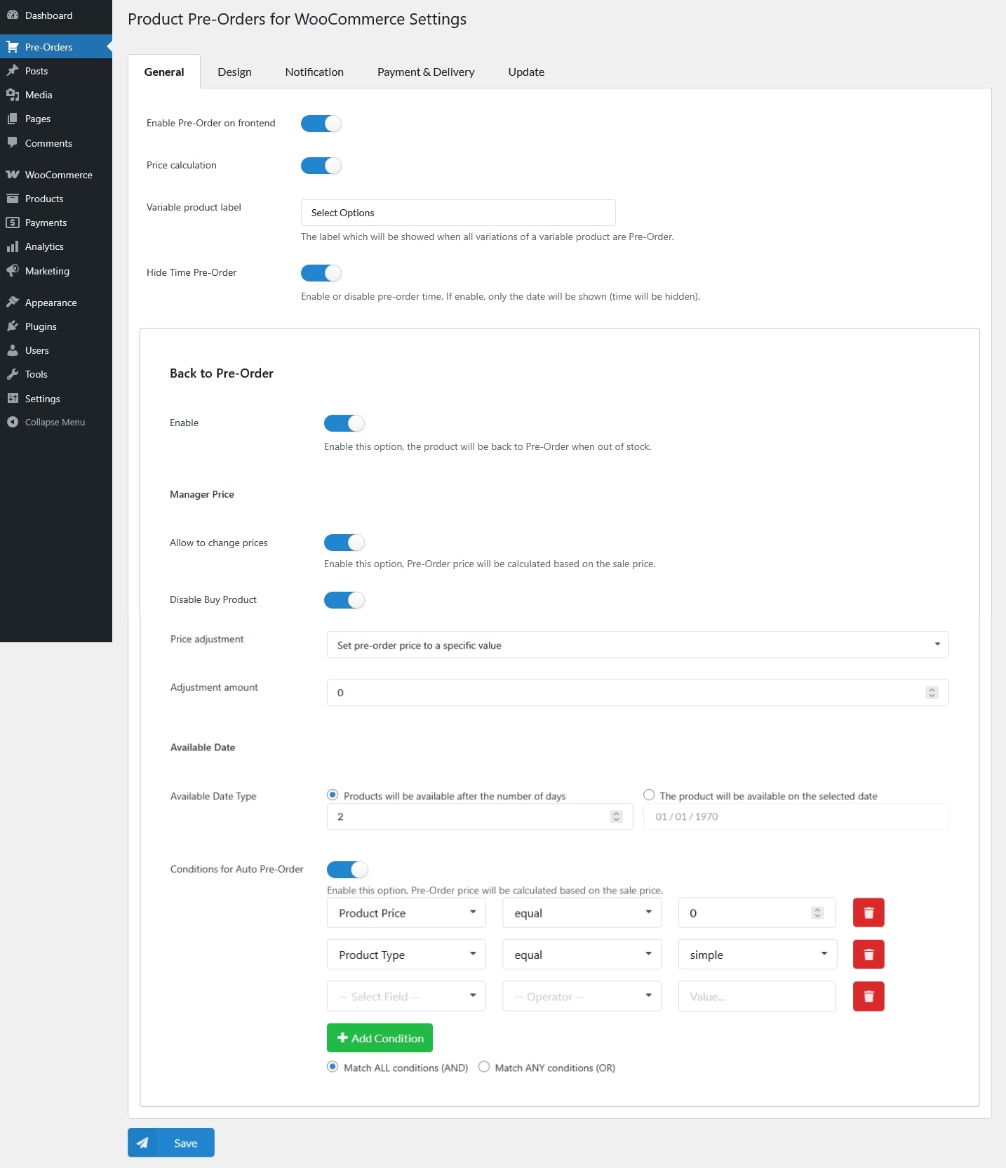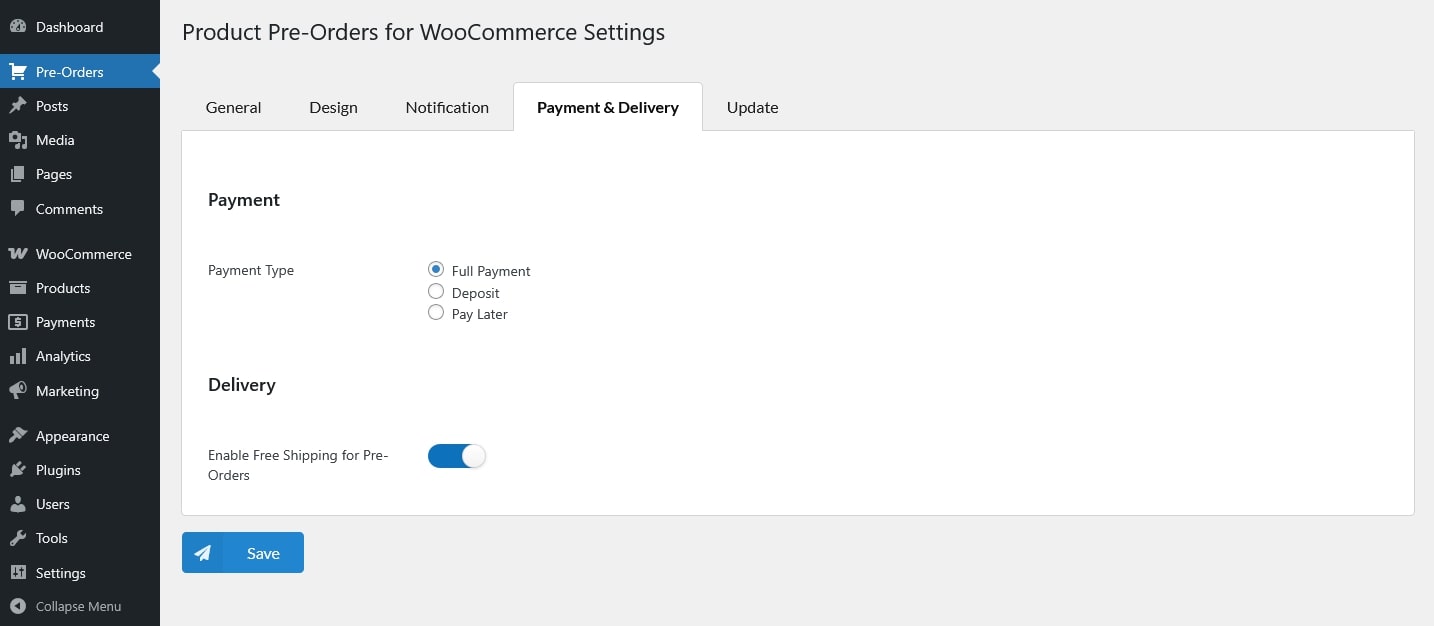 1. Go to WooCommerce → Pre-Order → Payment & Delivery Settings.