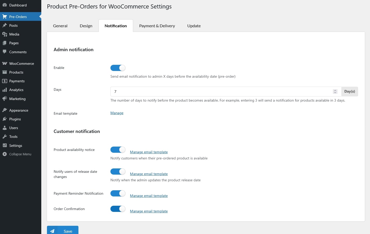 • Email Template: Click Manage to access and edit the template from the WooCommerce Emails settings page.