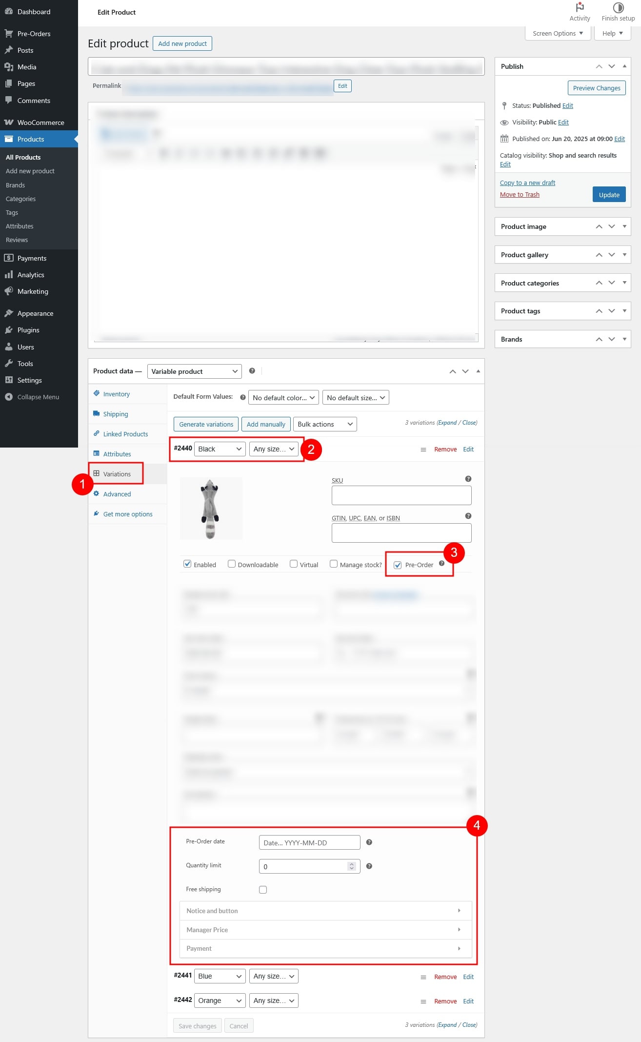 Check the Pre-Order checkbox for each variation that you want to enable for pre-order.